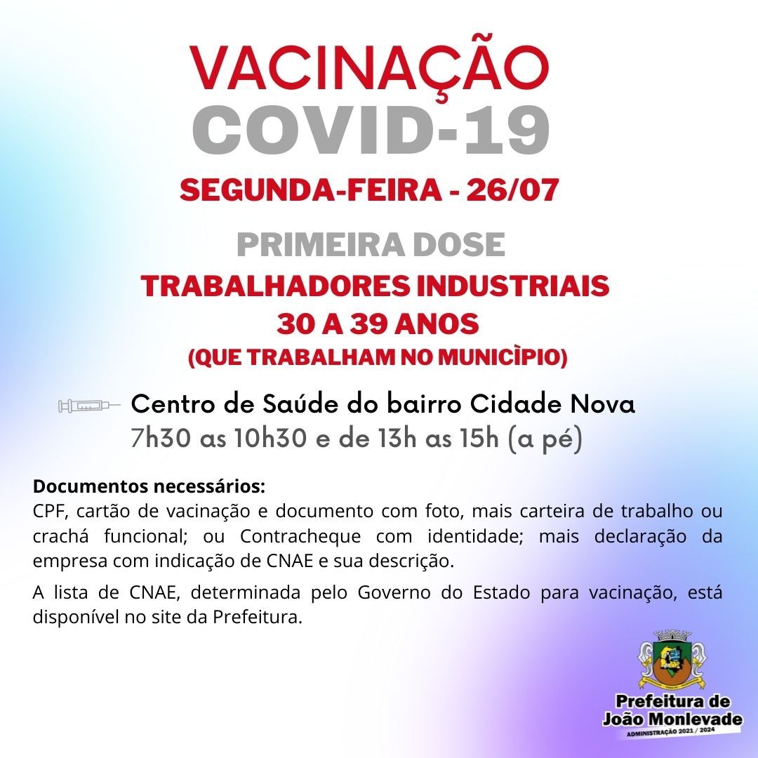 A vacinação dos trabalhadores industriais respeita a lista de Classificação Nacional de Atividades Econômicas (CNAE) divulgada pela Secretaria de Estado de Saúde de Minas Gerais e pode ser conferida no site da prefeitura no link