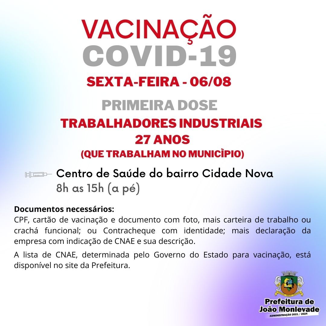 Prefeitura de João Monlevade vacina trabalhadores industriais de 27 anos Nesta sexta-feira (6), a Prefeitura de João Monlevade, por meio da Vigilância em Saúde (Visa), aplica a primeira dose da vacina contra o coronavírus em trabalhadores ind...