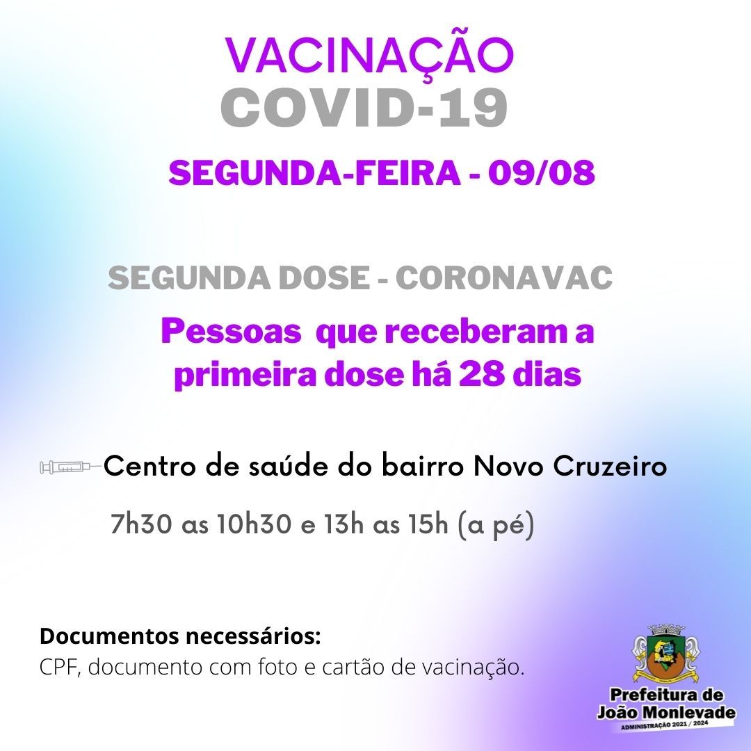Prefeitura de João Monlevade aplica segunda dose de AstraZeneca e Coronavac na segunda-feira (9) A Prefeitura de João Monlevade, por meio da Vigilância em Saúde (Visa), aplica a segunda dose de AstraZeneca e Coronavac na próxima segunda-feira...