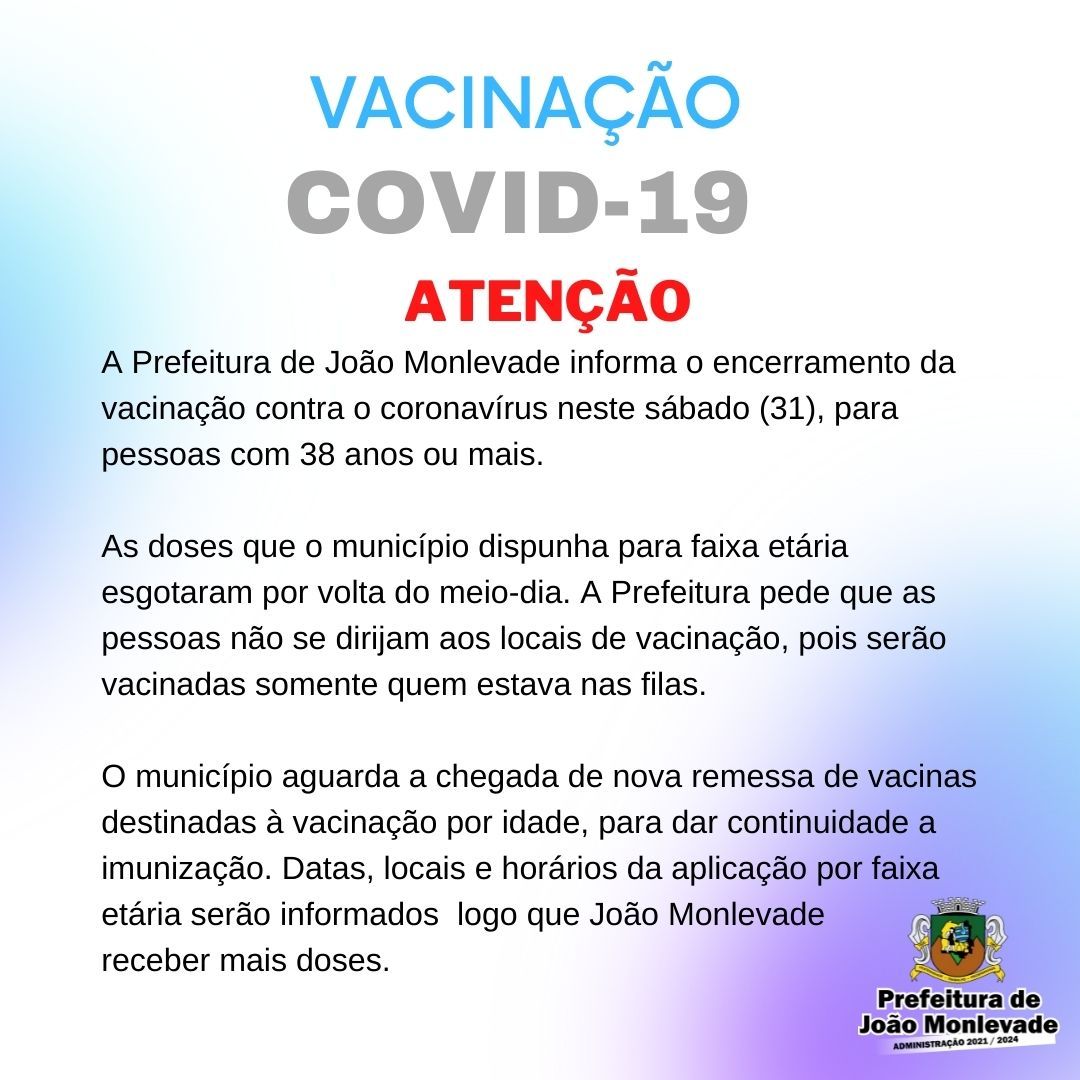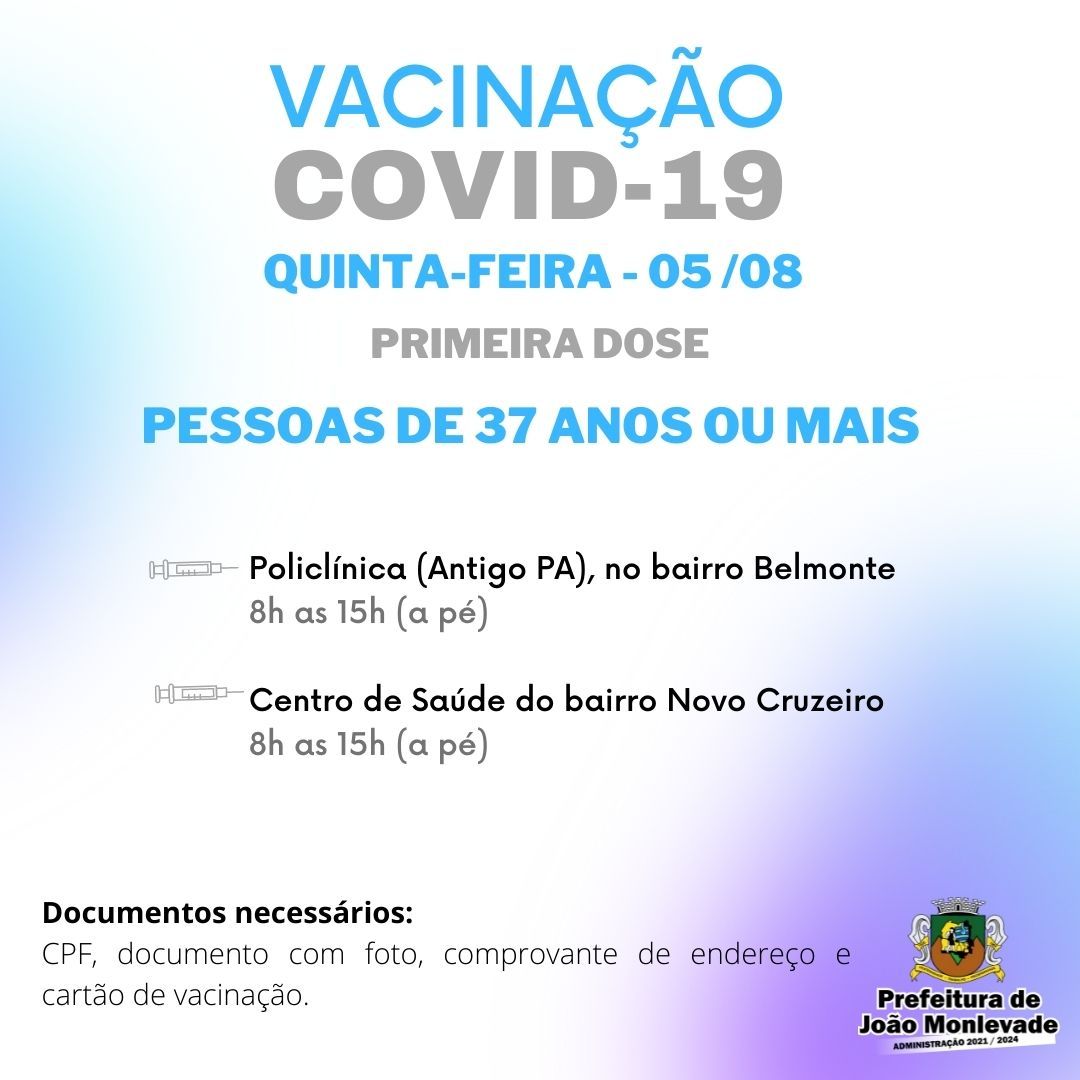 Prefeitura de João Monlevade amplia a vacinação para pessoas de 37 anos ou mais A Prefeitura de João Monlevade, por meio da Vigilância em Saúde (Visa), amplia a vacinação contra o coronavírus para as pessoas de 37 anos ou mais. A aplicaç...