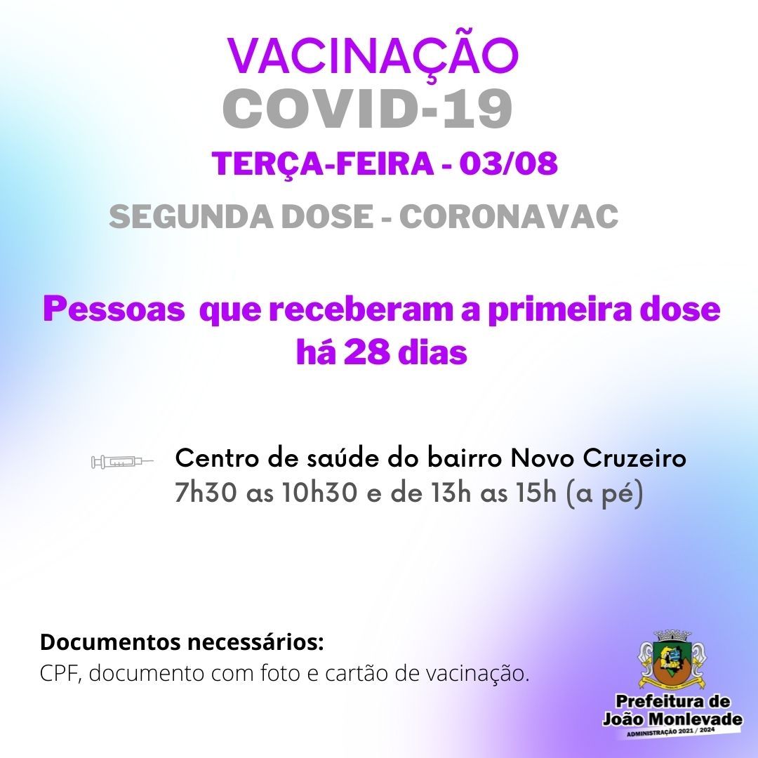 Prefeitura de João Monlevade aplica segunda dose de AstraZeneca e Coronavac nesta terça (03) Nesta terça-feira (03) a Prefeitura de João Monlevade, por meio da Vigilância em Saúde (Visa), prossegue com a aplicação da segunda dose da vacina...