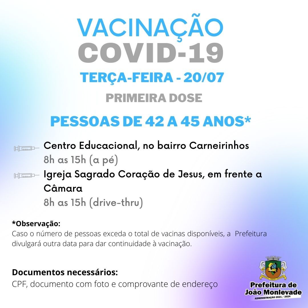 Prefeitura de João Monlevade amplia vacinação para pessoas de 42 a 45 anos A Prefeitura de João Monlevade, por meio da Vigilância em Saúde (Visa), amplia a vacinação contra o coronavírus para as pessoas de 42 a 45 anos. A vacinação dess...