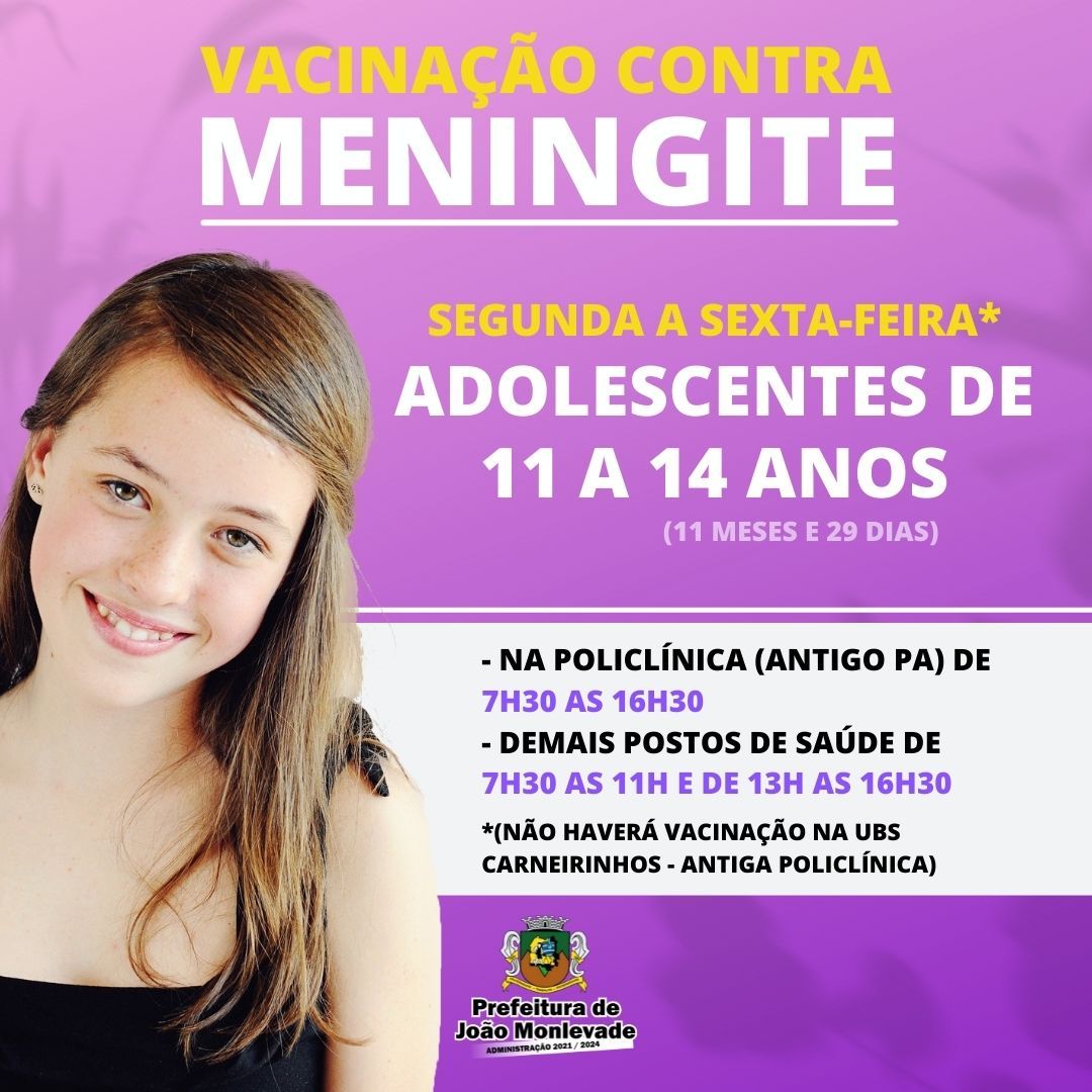 Prefeitura vacina adolescentes de 11 a 14 anos contra meningite A Prefeitura de João Monlevade, por meio da Vigilância em Saúde (Visa), vacina adolescentes de 11 a 14 anos (nascidos de 03/01/2007 a 31/12/2010) contra meningite. A vacina meningo...