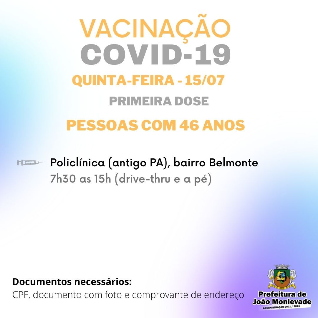 Prefeitura de João Monlevade amplia vacinação para pessoas de 46 e 47 anos Segunda dose para idosos com 60 anos ou mais ocorre no Centro Educacional A Prefeitura de João Monlevade, por meio da Vigilância em Saúde (Visa), amplia a vacina...