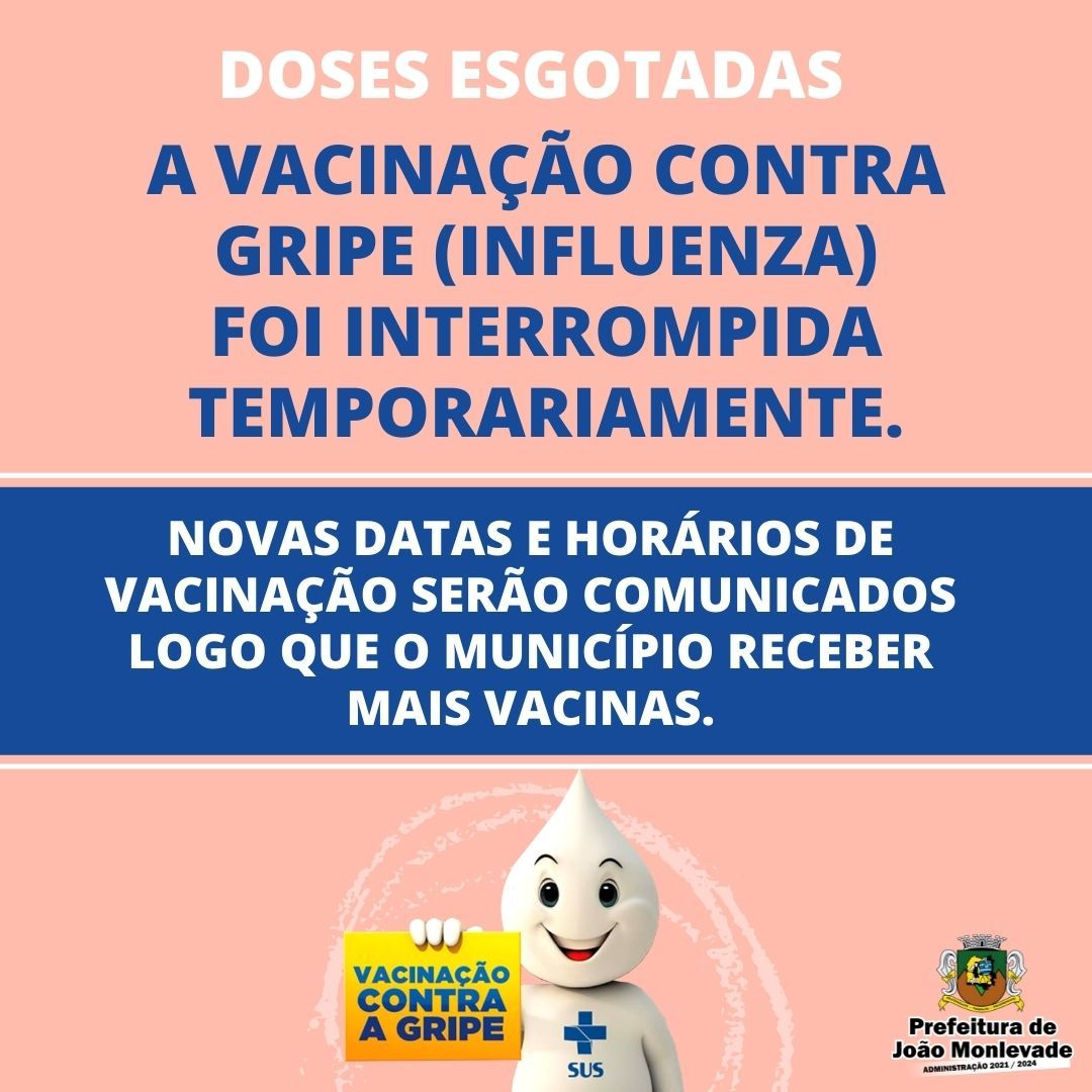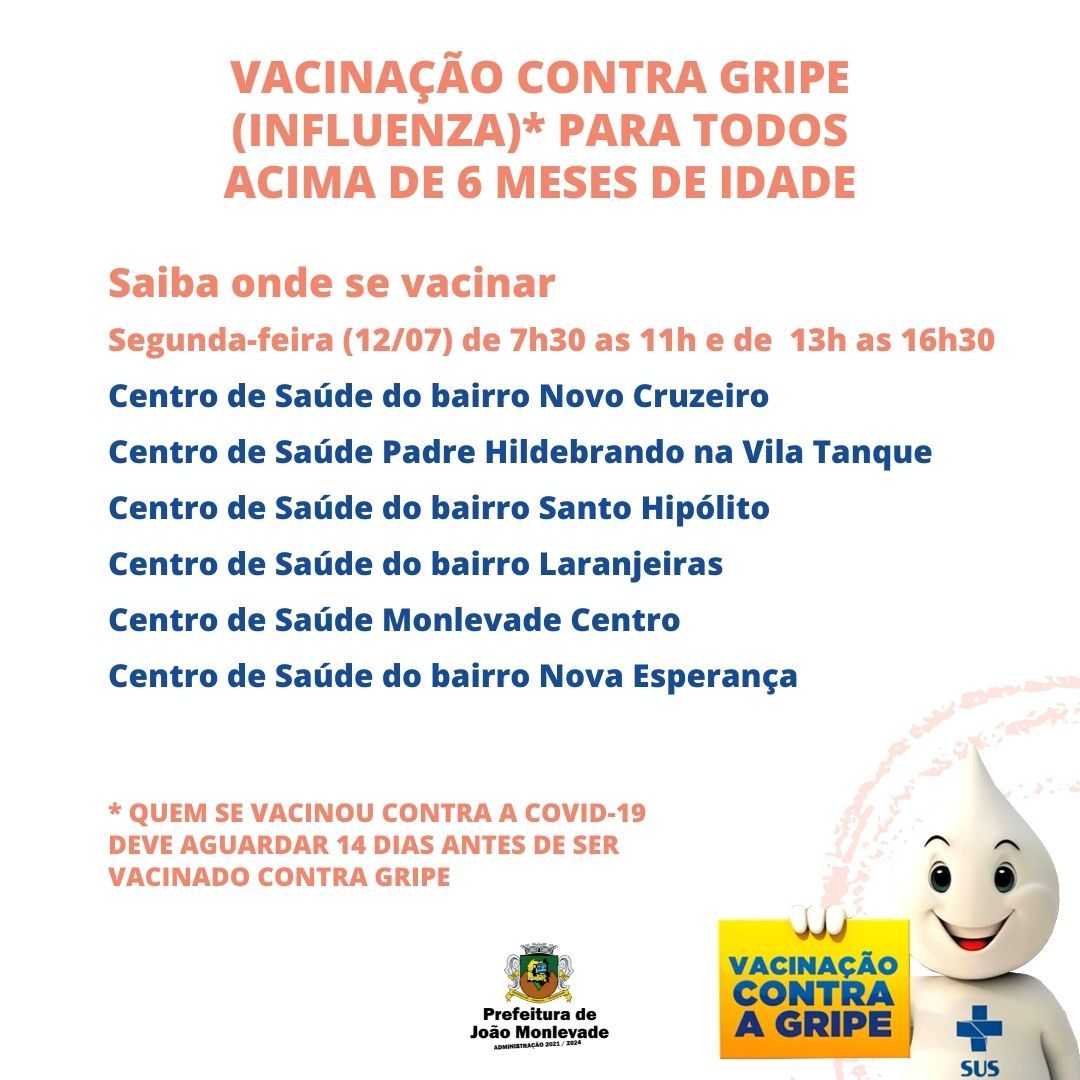 Vacinação contra gripe continua na segunda-feira (12) A Prefeitura de João Monlevade, por meio da Vigilância em Saúde, continuará a vacinação contra a gripe (influenza), aberta a toda a população acima de seis meses, na próxima segunda-...
