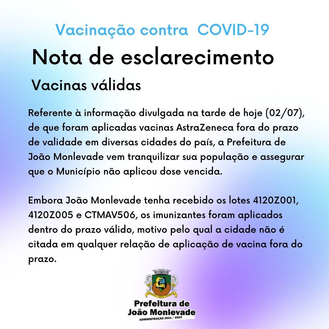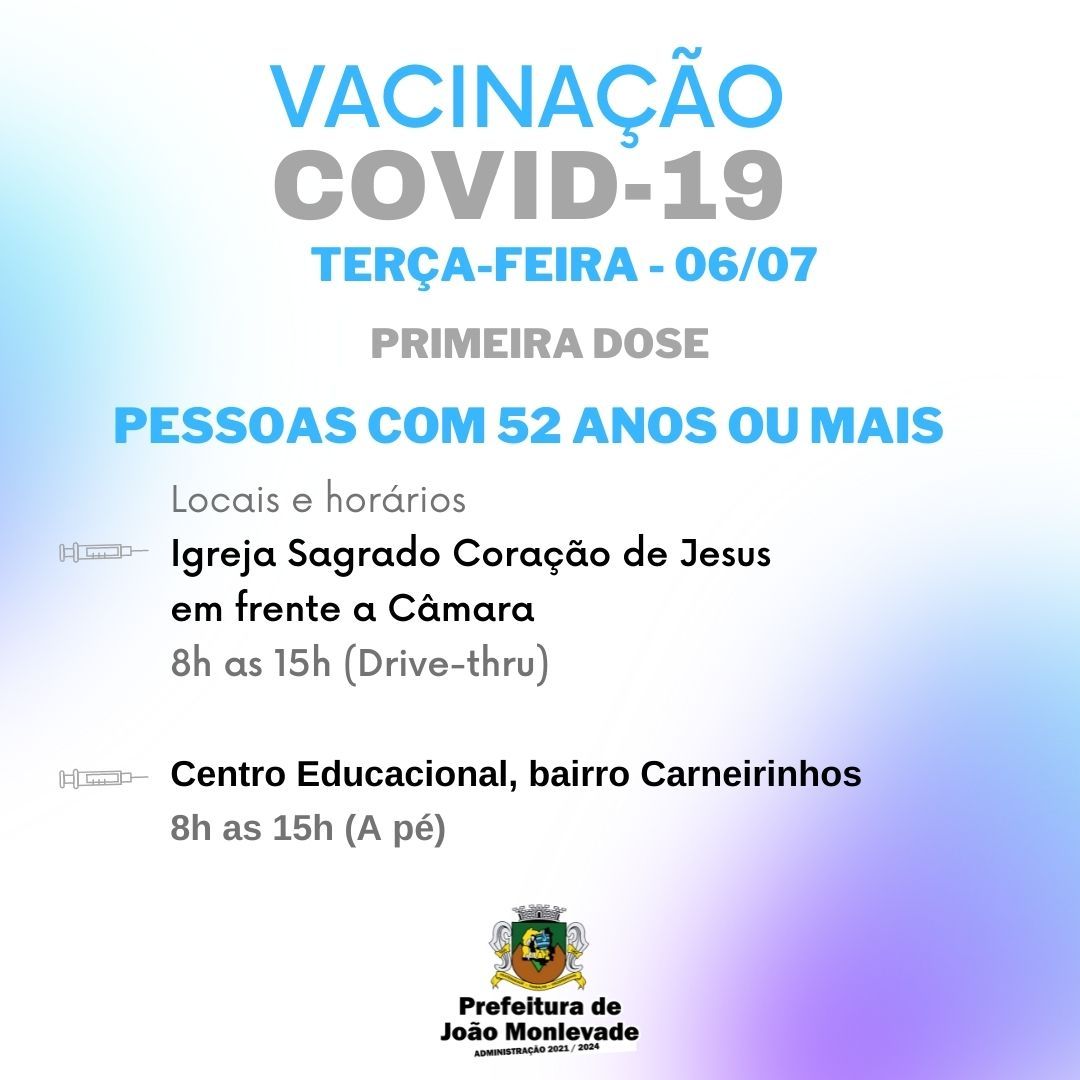 Prefeitura de João Monlevade começa a vacinar pessoas com 51 e 52 anos Nesta terça-feira (6), a Prefeitura de João Monlevade, por meio da Vigilância em Saúde (Visa), começa a vacinar contra o coronavírus a população com 52 anos. Na quart...