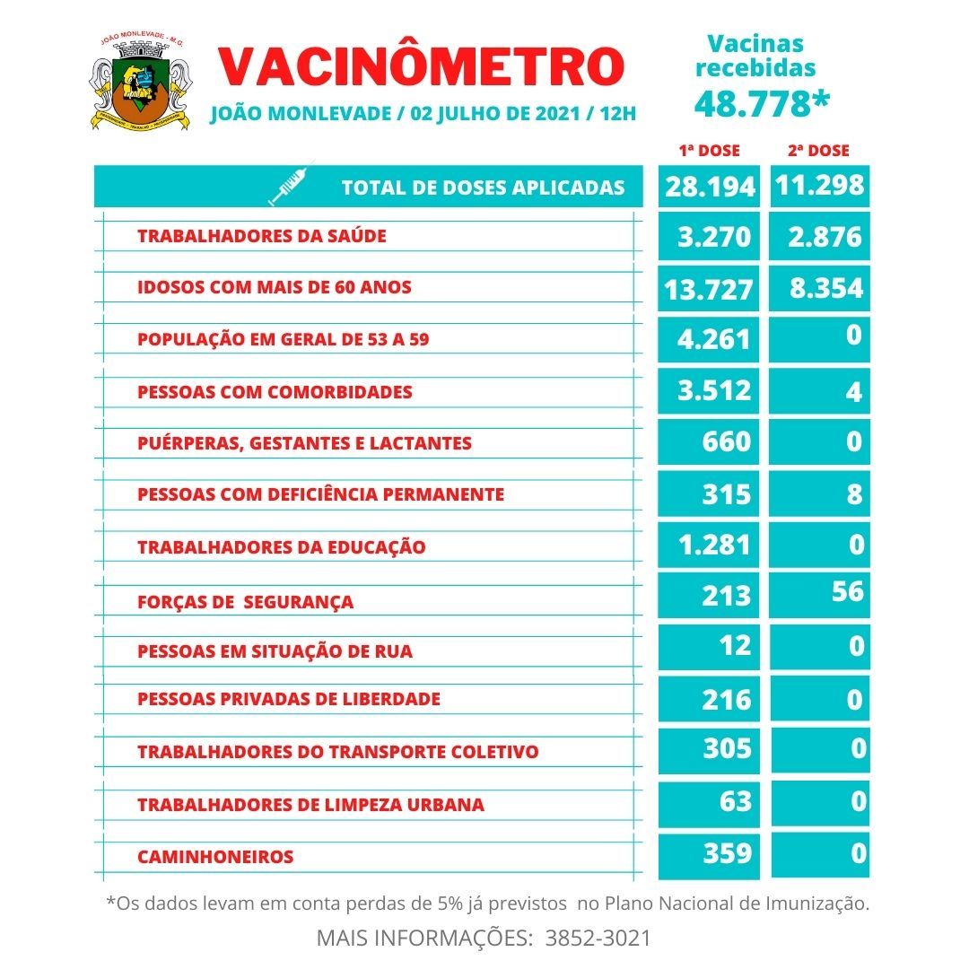 Vacinômetro A Prefeitura de João Monlevade esclarece que as vacinas que o município dispõe são para grupos prioritários, sendo que a grande maioria são segundas doses destinadas a idosos com 60 anos ou mais....