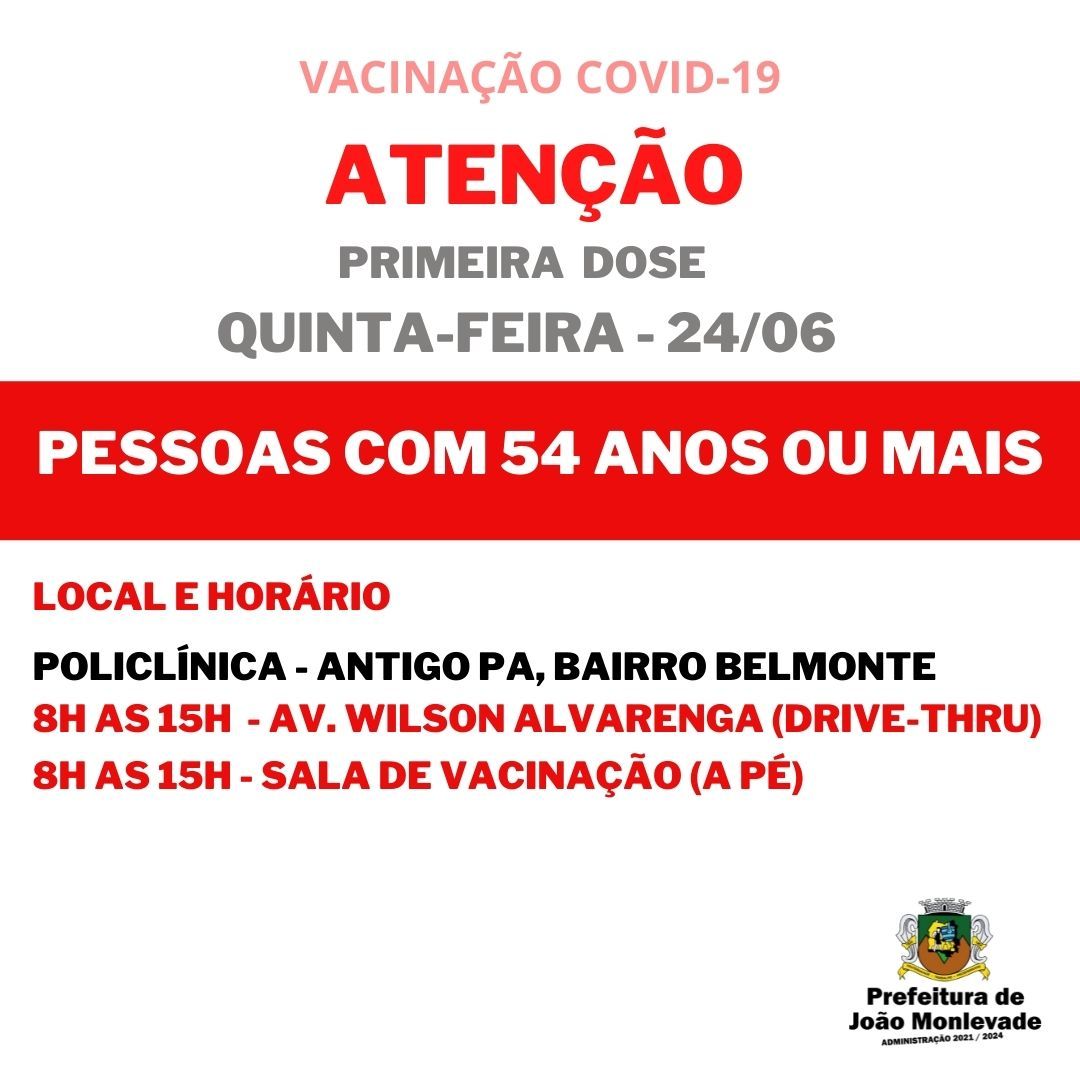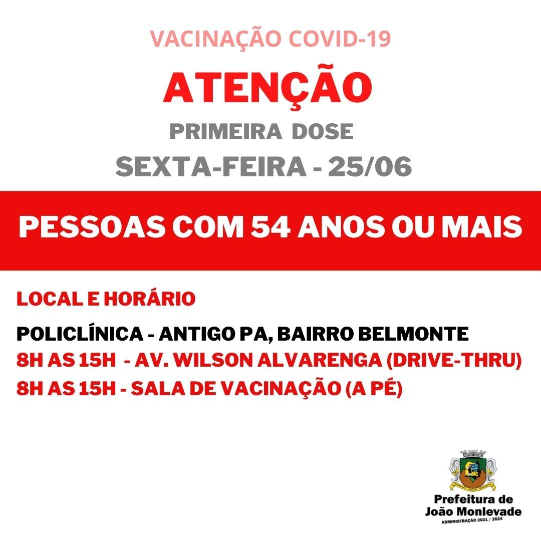 Vacinação de pessoas com 54 anos prossegue nesta sexta-feira (25) Nesta sexta-feira (25), a Prefeitura de João Monlevade, por meio da Vigilância em Saúde (Visa), prossegue com a vacinação de pessoas com 54 anos ou mais. A aplicação da ...