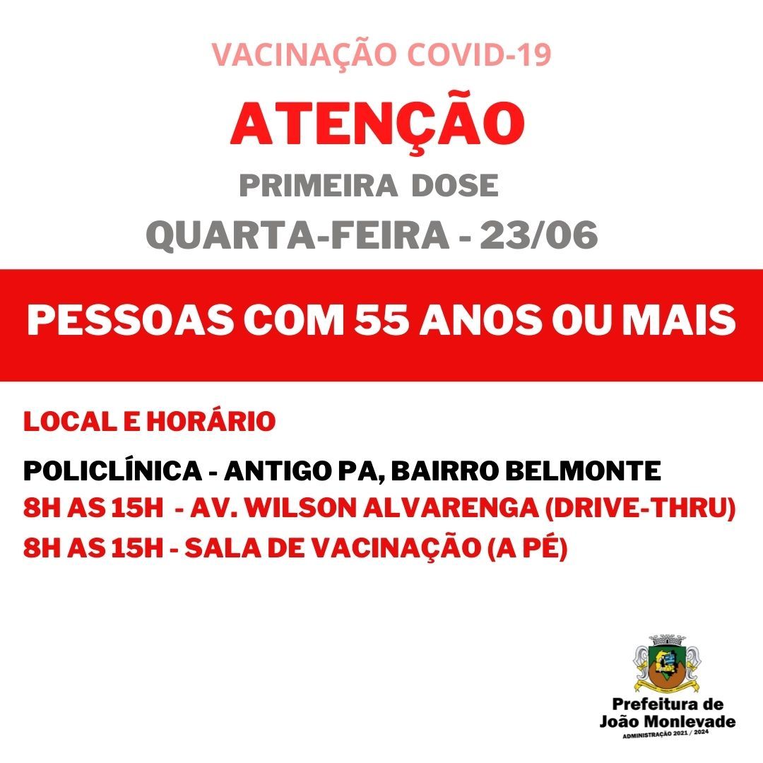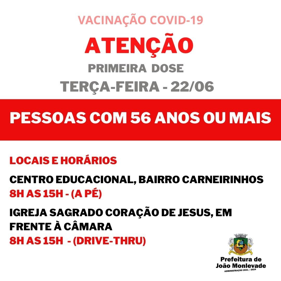 Vacinação de pessoas com 56 anos prossegue nesta terça-feira (22) Amanhã (22), a Prefeitura de João Monlevade, por meio da Vigilância em Saúde (Visa), prossegue com a vacinação de pessoas com 56 anos ou mais. A aplicação da primeira ...