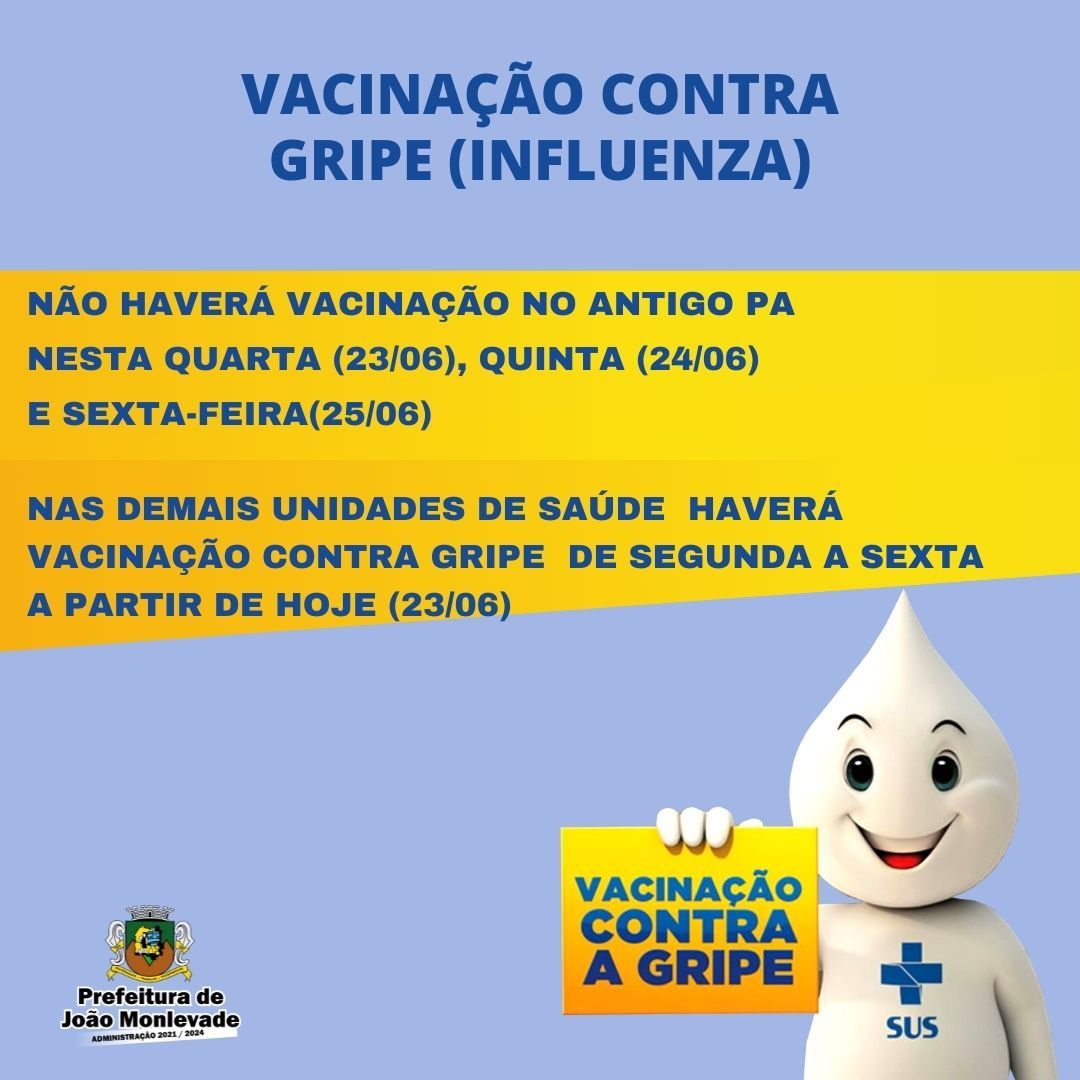 Vacinação contra gripe ocorre em oito postos de saúde de segunda a sexta A partir de hoje (23), a vacinação contra gripe (influenza) ocorrerá de segunda a sexta em oito unidades de saúde de João Monlevade. A ampliação foi possível depoi...