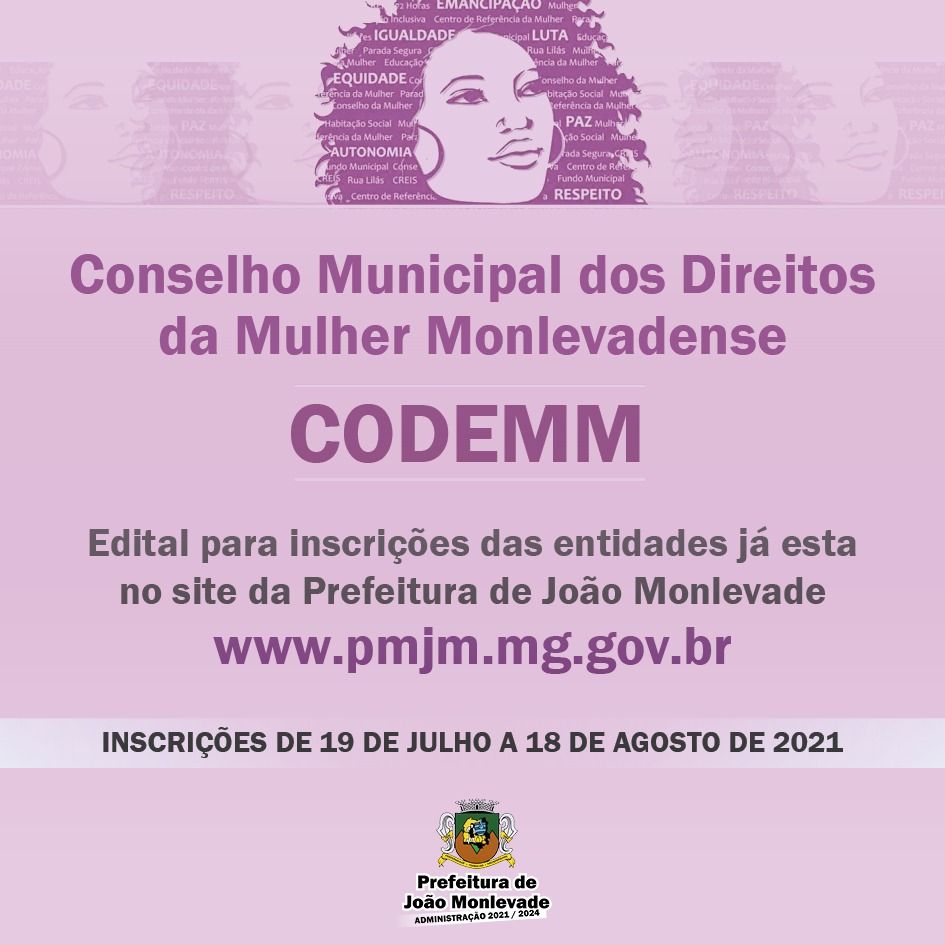 Inscrições das entidades para compor o Conselho da Mulher serão em julho A Comissão formada para elaborar o processo de eleição do Conselho Municipal dos Direitos da Mulher Monlevadense (CODEMM), divulga o edital para sua composição para o...