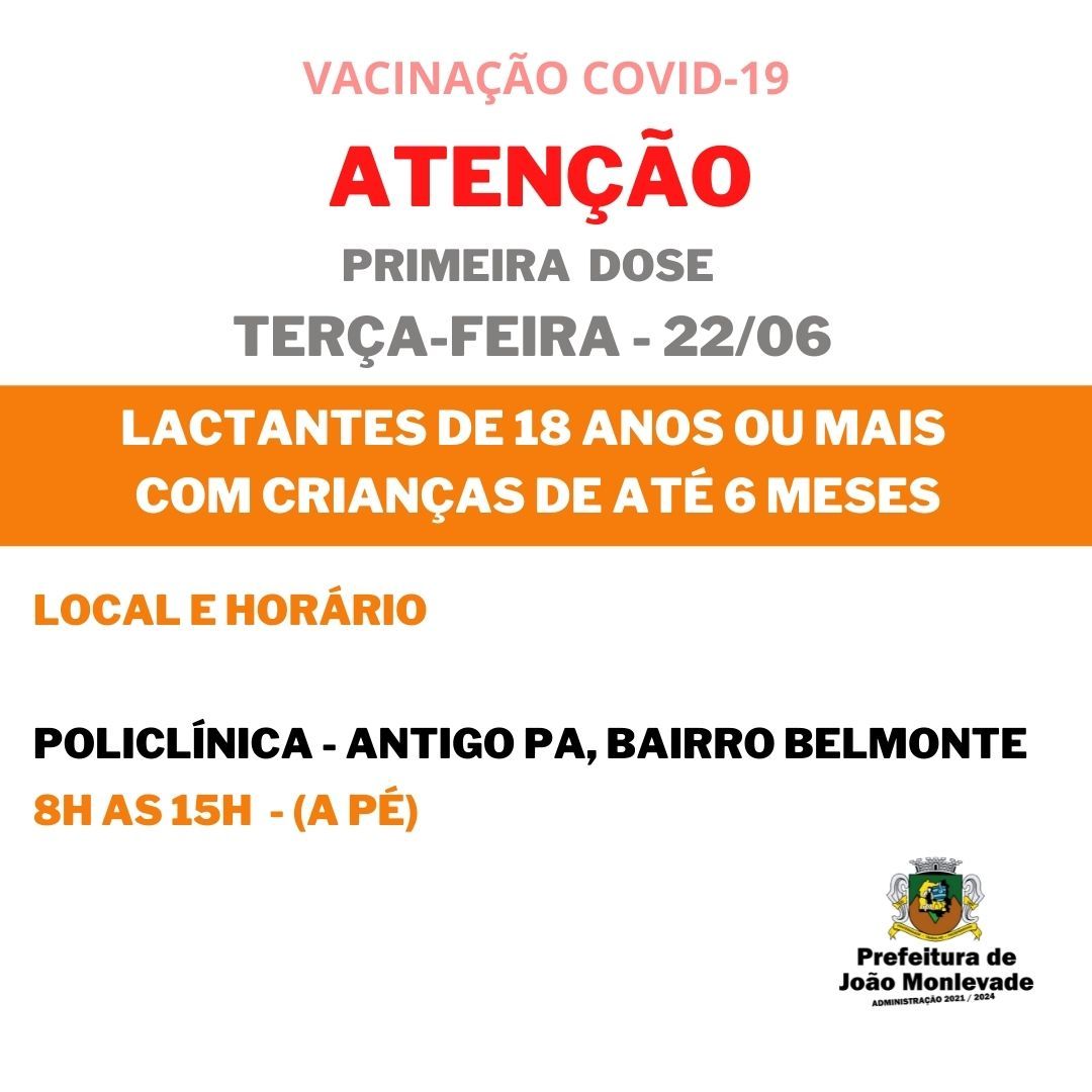 Prefeitura de João Monlevade começa a vacinar lactantes amanhã (22) Nesta terça-feira (22), a Prefeitura de João Monlevade, por meio da Vigilância em Saúde (Visa), começa a vacinar contra o coronavírus as lactantes (mulheres que amamentam...