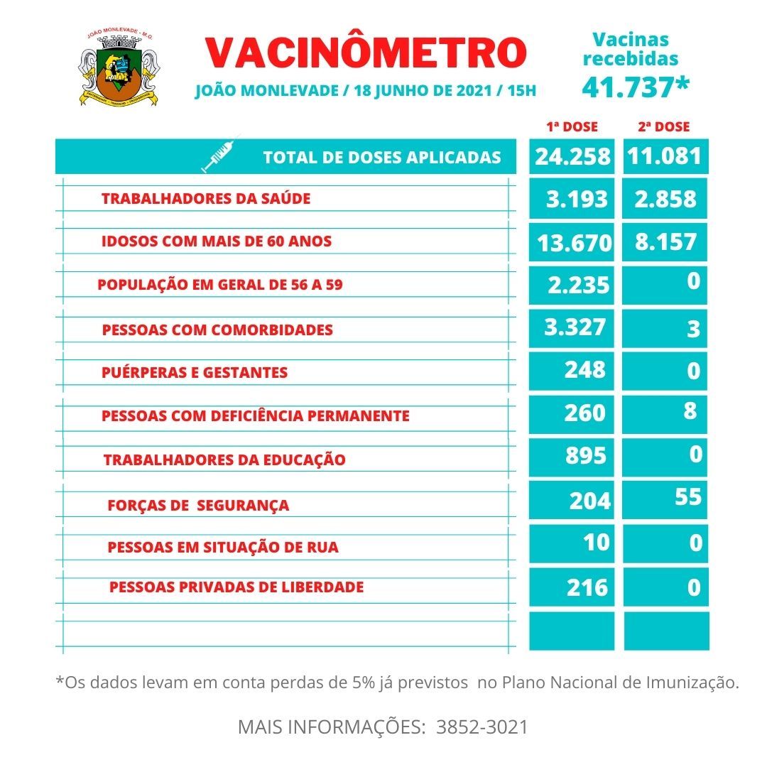 Vacinação de pessoas com 56 anos continua na segunda-feira (21) Na próxima segunda-feira (21), a Prefeitura de João Monlevade, por meio da Vigilância em Saúde (Visa), continua vacinando contra o coronavírus as pessoas com 56 anos ou mais. ...