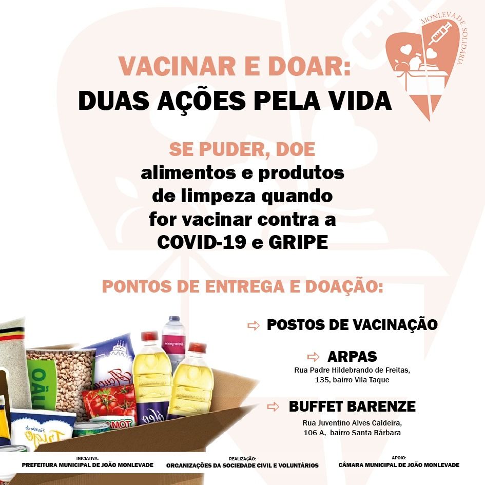 Além dos postos de saúde, alimentos podem ser entregues na Sociedade São Vicente de Paulo (SVP), Arpas e Buffet Barenze. A Campanha para coleta de alimentos “Monlevade Solidária: Vacinar e doar, duas ações pela vida”, prossegue no mu...