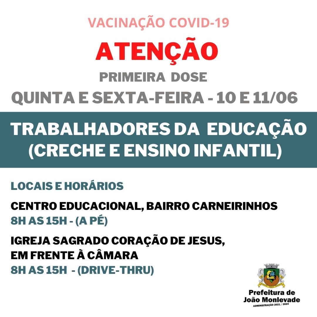 Prefeitura retoma vacinação de trabalhadores da educação amanhã (10) A Prefeitura de João Monlevade, por meio da Vigilância em Saúde (Visa), dará continuidade à aplicação da primeira dose da vacina contra coronavírus em trabalhadores ...