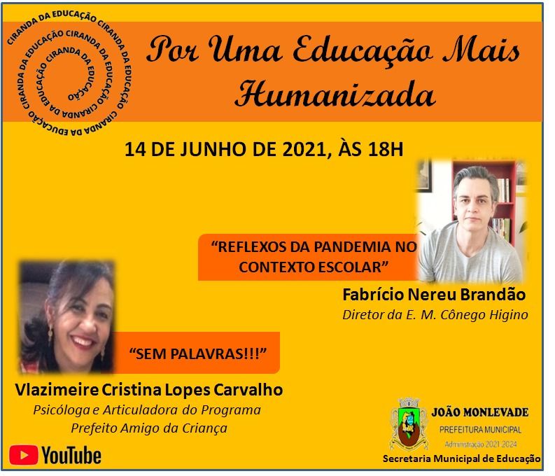 Os trabalhos serão com o professor Fabrício Brandão e com a psicóloga Vlazimeire Carvalho A Secretaria Municipal de Educação promove, na próxima segunda-feira (14), às 18h, por meio do canal do Youtube da Prefeitura de João Monleva...