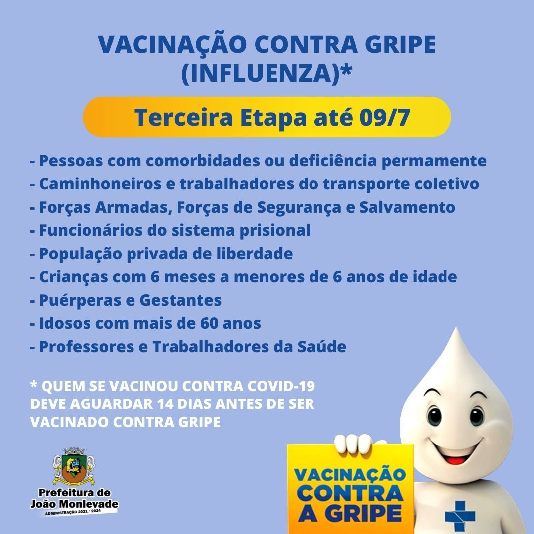 Campanha de vacinação contra gripe (influenza) entra na terceira etapa Esta semana, a Campanha Nacional de Vacinação contra gripe (influenza) entra na terceira etapa, que vai até 9 de julho. Em João Monlevade, a imunização prossegue em nov...