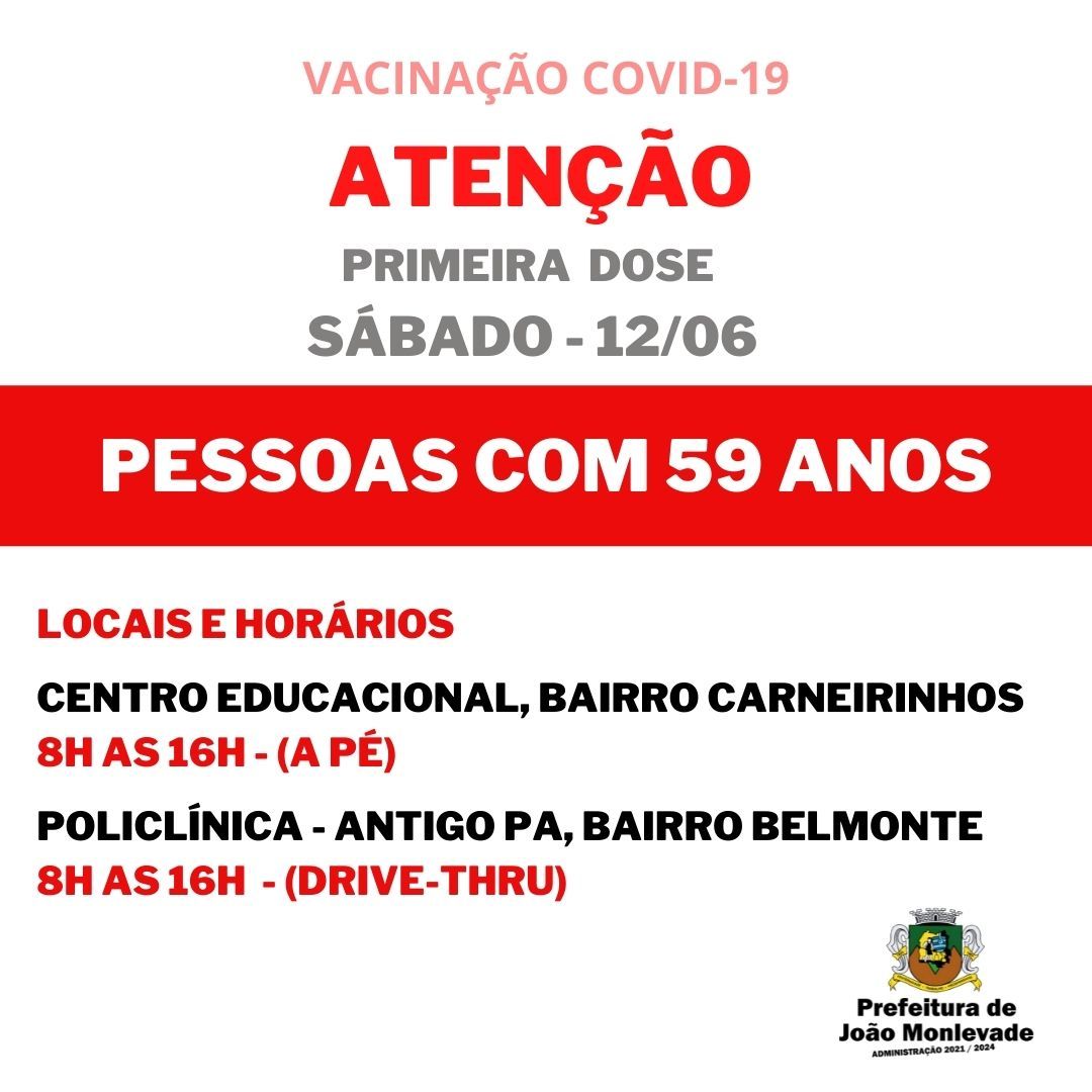 Prefeitura começa a vacinar pessoas de 59 anos contra o coronavírus No sábado (12), a Prefeitura de João Monlevade, por meio da Vigilância em Saúde (Visa), começa a vacinar contra o coronavírus a população em geral, por faixa etária. Ou...