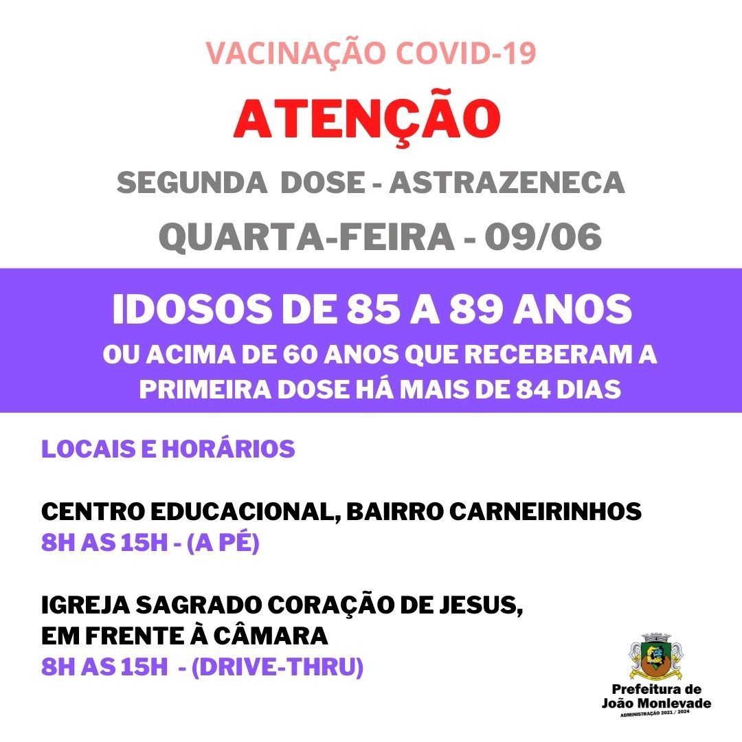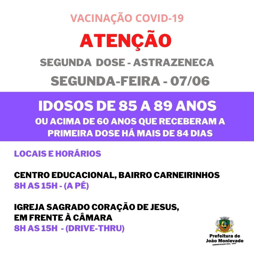Prefeitura prossegue com aplicação da segunda dose em idosos de 85 a 89 anos Na segunda-feira (7), a Prefeitura de João Monlevade, por meio da Vigilância em Saúde (Visa), prossegue com a aplicação da segunda dose da vacina AstraZeneca em id...