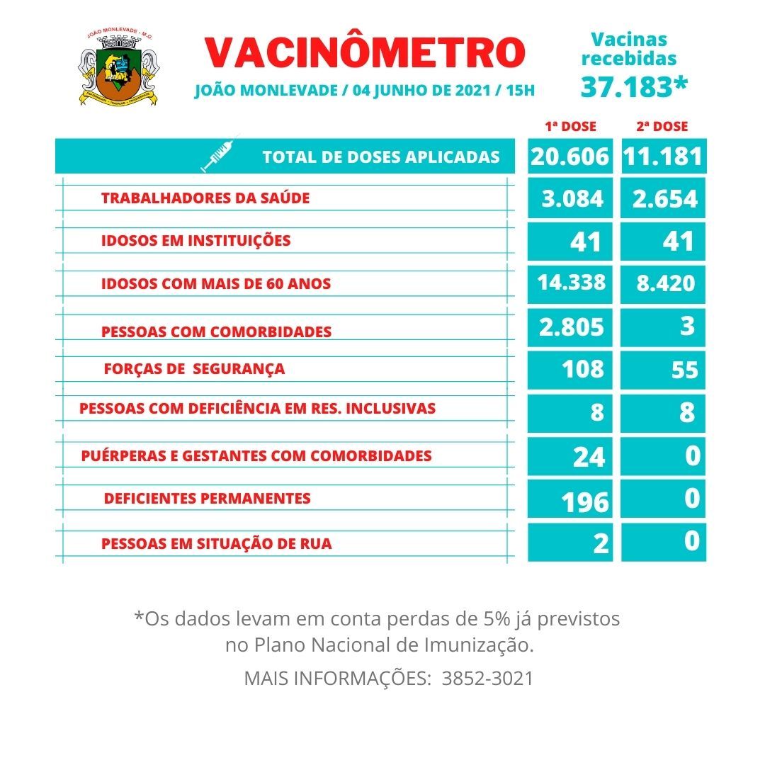 Prefeitura prossegue com vacinação de pessoas com comorbidades Município aguarda novas remessas para continuar vacinando trabalhadores da educação Nesta quarta-feira (9), a Prefeitura de João Monlevade, por meio da Vigilância em Saúde ...