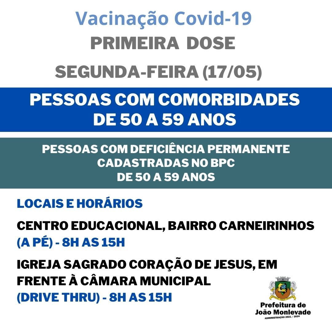 Prefeitura de João Monlevade segue com vacinação de pessoas com comorbidades na segunda-feira (17) Na segunda-feira (17), a Prefeitura de João Monlevade, por meio da Vigilância em Saúde (Visa), prossegue com a aplicação da primeira dose da...