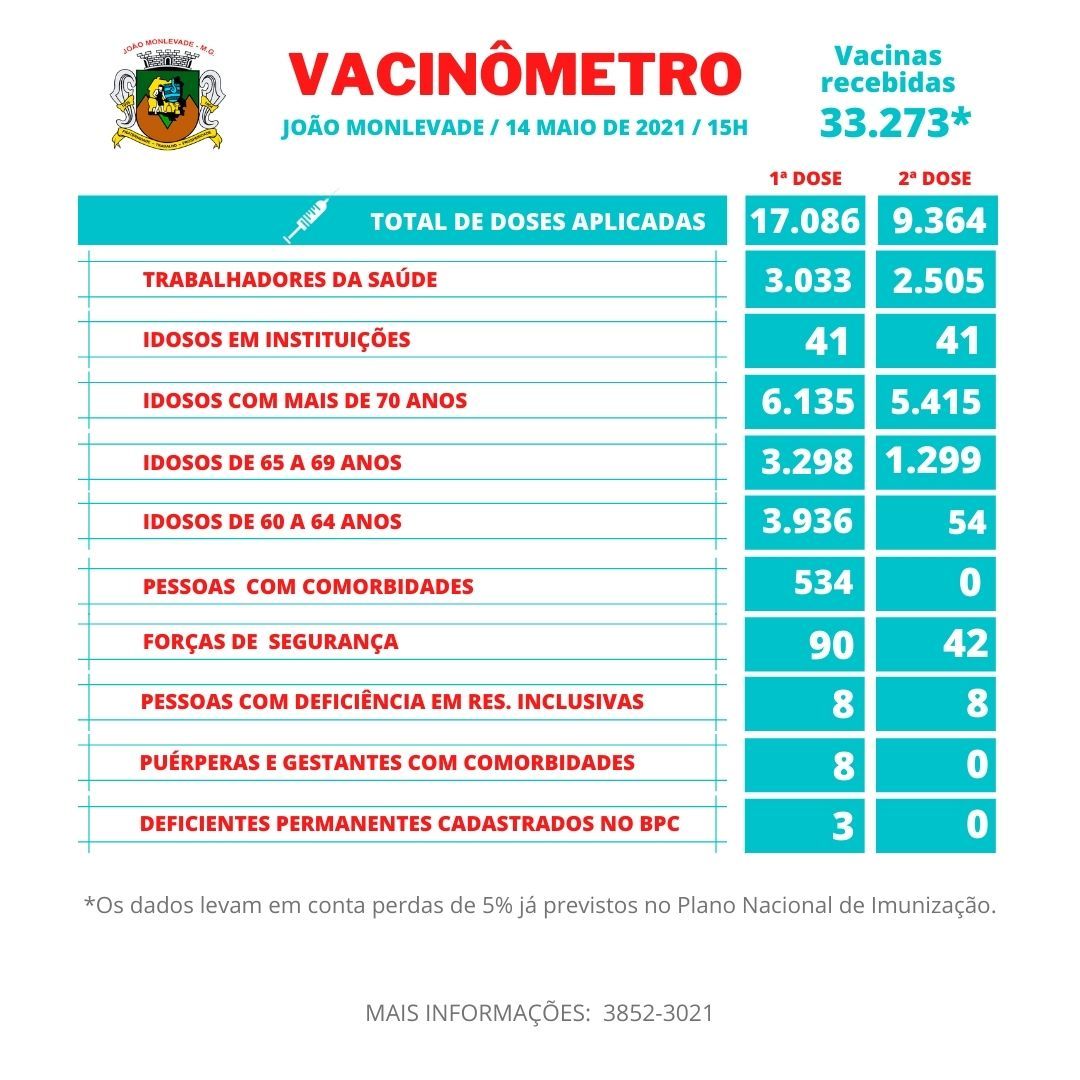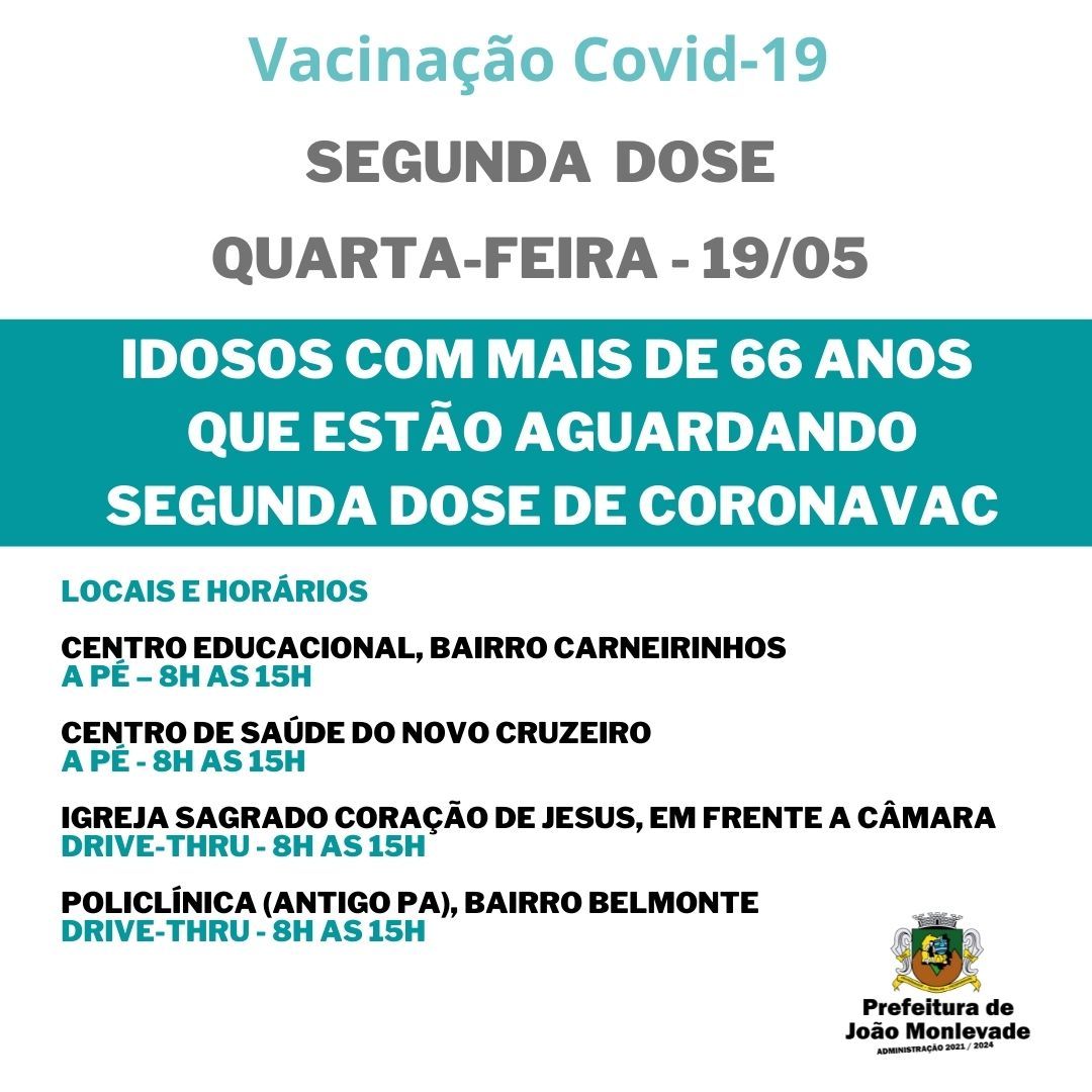 Prefeitura de João Monlevade vacina idosos com mais de 66 anos que aguardam a segunda dose de Coronavac A Prefeitura de João Monlevade, por meio da Vigilância em Saúde (Visa), fará nesta quarta-feira (19) a aplicação da vacina Coronavac e...