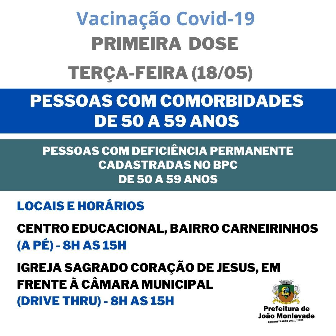 Vacinação de pessoas com comorbidades continua nesta terça-feira (18) em João Monlevade A Prefeitura de João Monlevade, por meio da Vigilância em Saúde (Visa), prossegue nesta terça-feira (18), com a aplicação da primeira dose da vacina ...