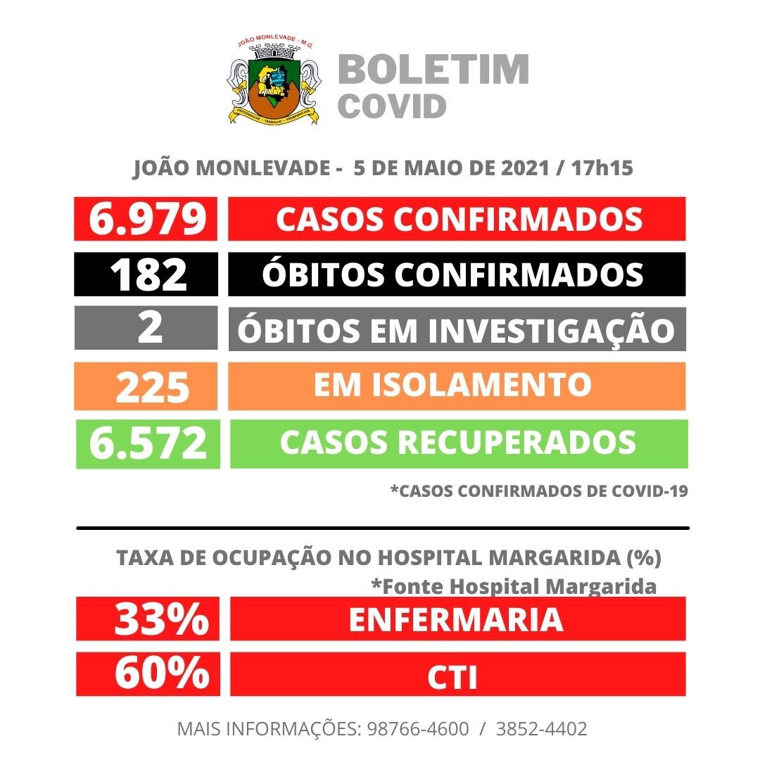Quarta-feira – 5 de maio de 2021 Foram notificados hoje mais 16 casos de coronavírus em João Monlevade. Hoje foi registrado óbito de paciente do sexo masculino de 90 anos. Confirmado também dois óbitos ocorridos ontem de pacien...