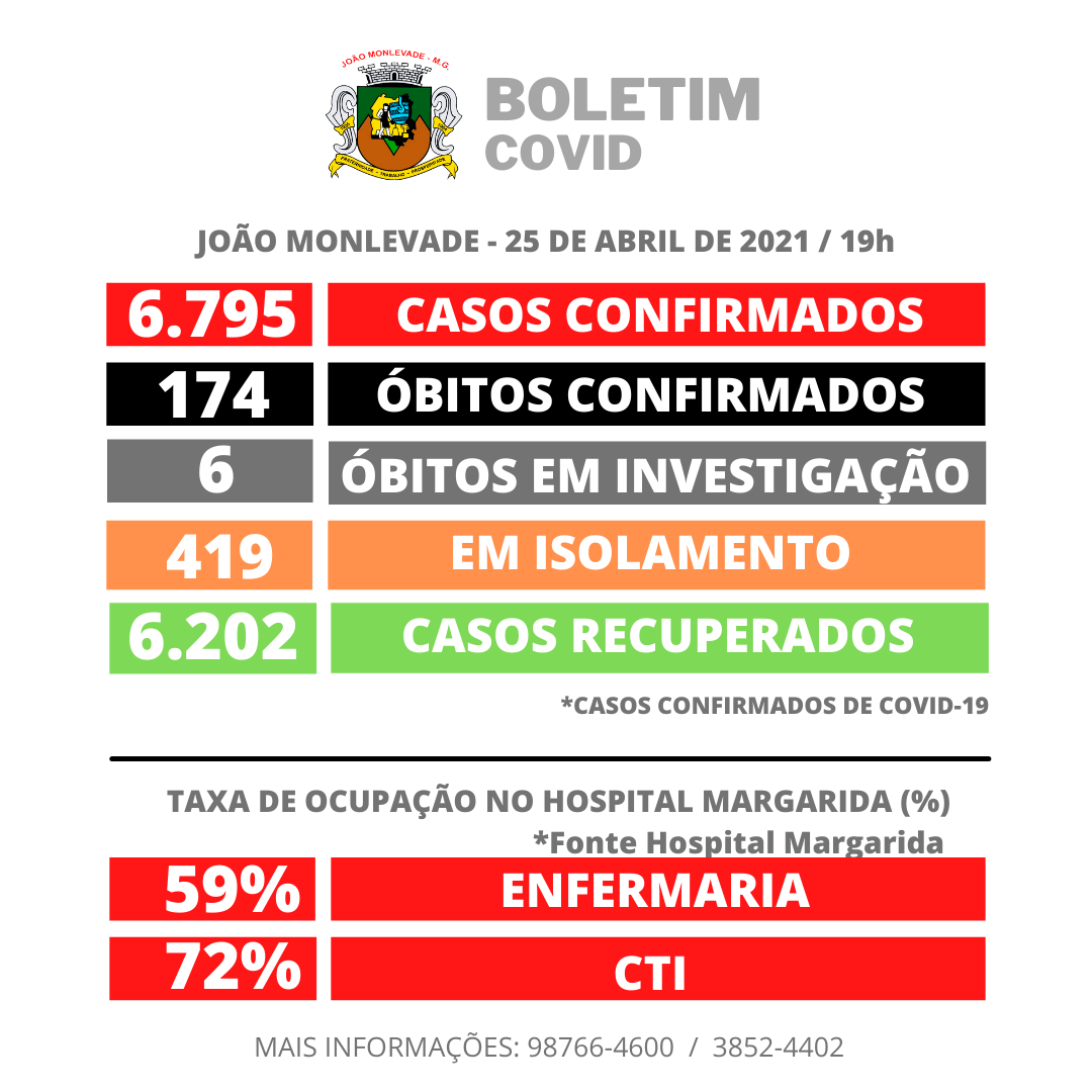 JOÃO MONLEVADE TEM 6.817 CASOS DE CASOS DE COVID-19 Segunda-feira – 26 de abril de 2021 Foram notificados mais 22 casos de coronavírus. Hoje, confirmado óbito de paciente do sexo masculino de 87 anos, que estava em investigação...