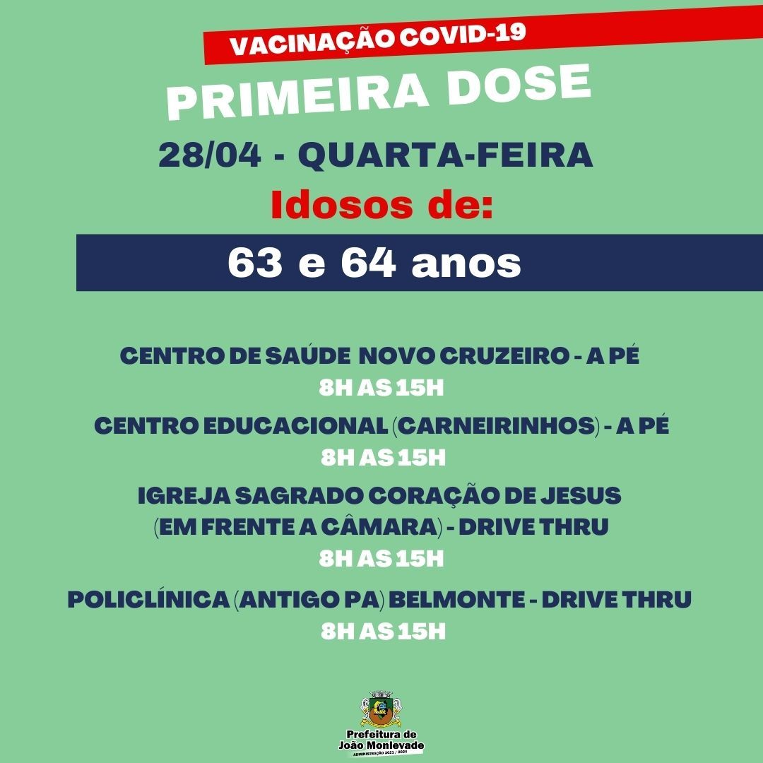 Idosos de 63 e 64 anos recebem primeira dose da vacina amanhã A Secretaria de Saúde de João Monlevade, por meio da Vigilância em Saúde (Visa), aplicará a primeira dose da vacina contra o coronavírus,...