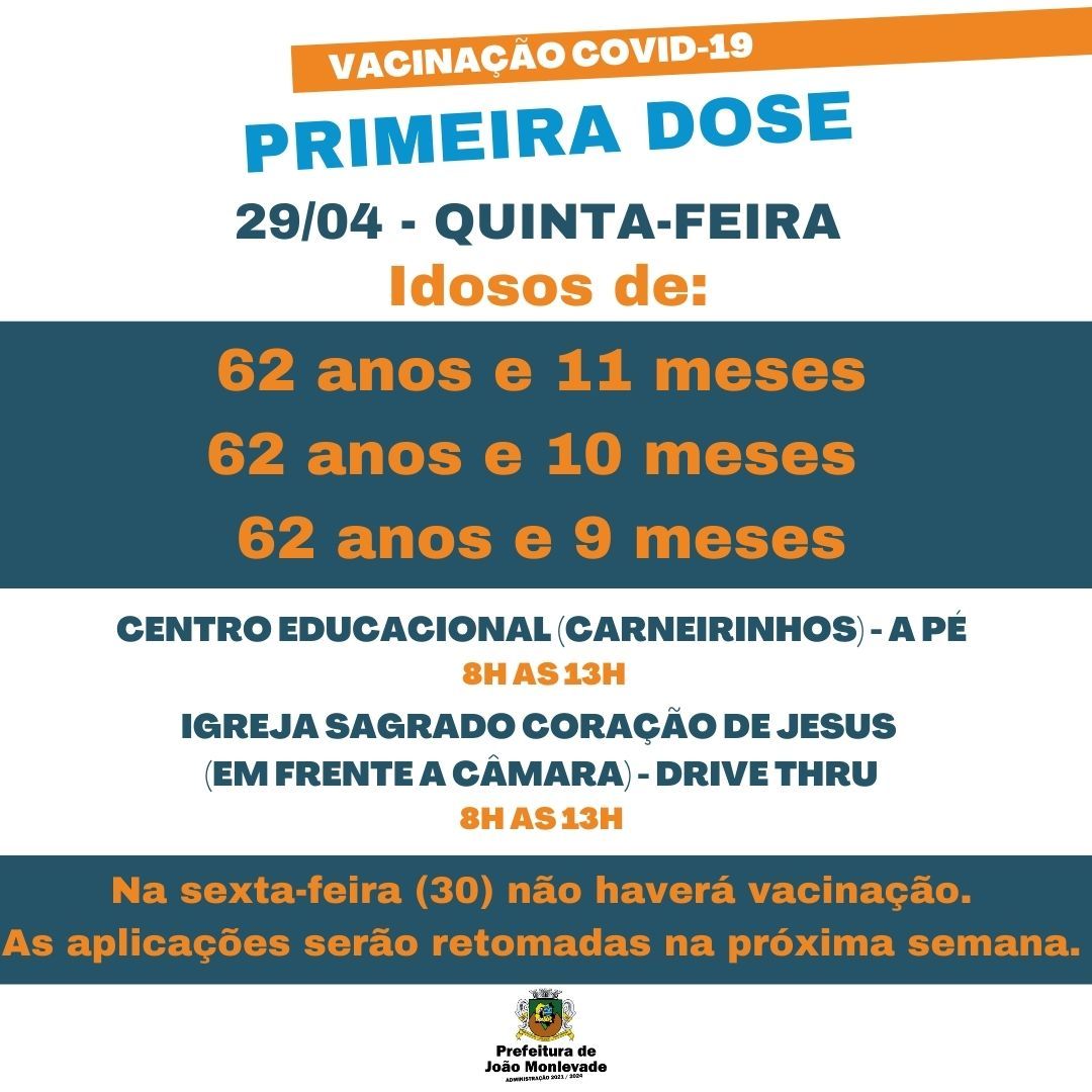 Secretaria de Saúde inicia vacinação de idosos com 62 anos A Secretaria de Saúde de João Monlevade, por meio da Vigilância em Saúde (Visa), começa amanhã, quinta-feira (29), a aplicar a primeira dose da vacina contra o coronavírus em ido...