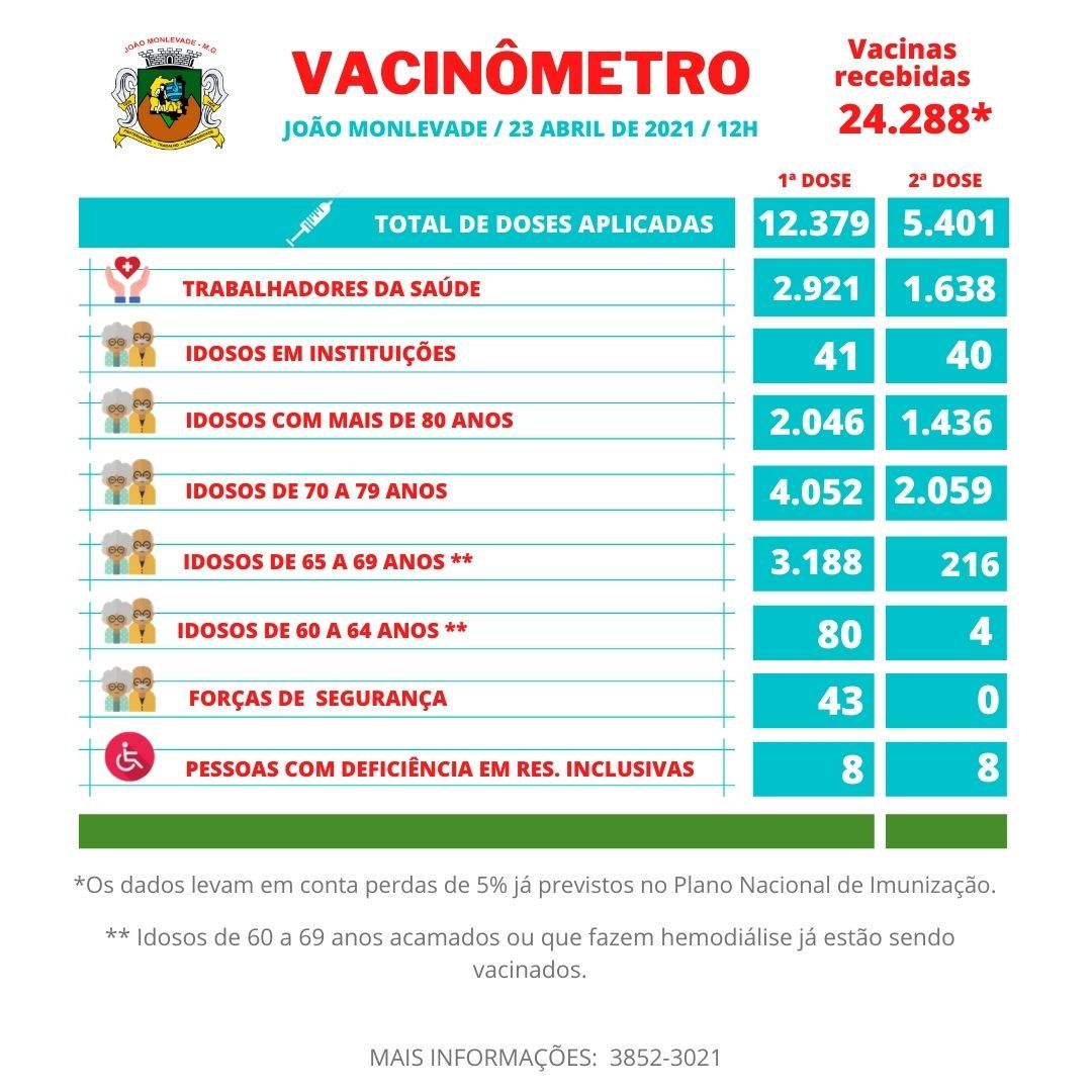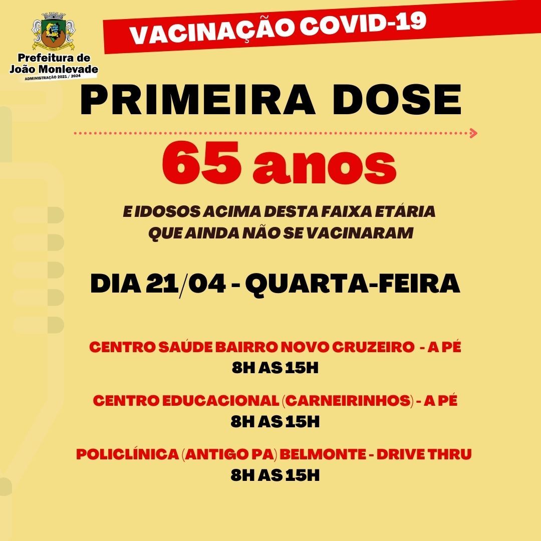 Secretaria de Saúde começa vacinar idosos de 64 anos nesta sexta-feira A Secretaria de Saúde de João Monlevade, por meio da Vigilância em Saúde (Visa), começa amanhã, sexta-feira (23), a ...