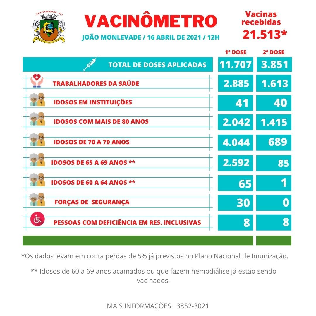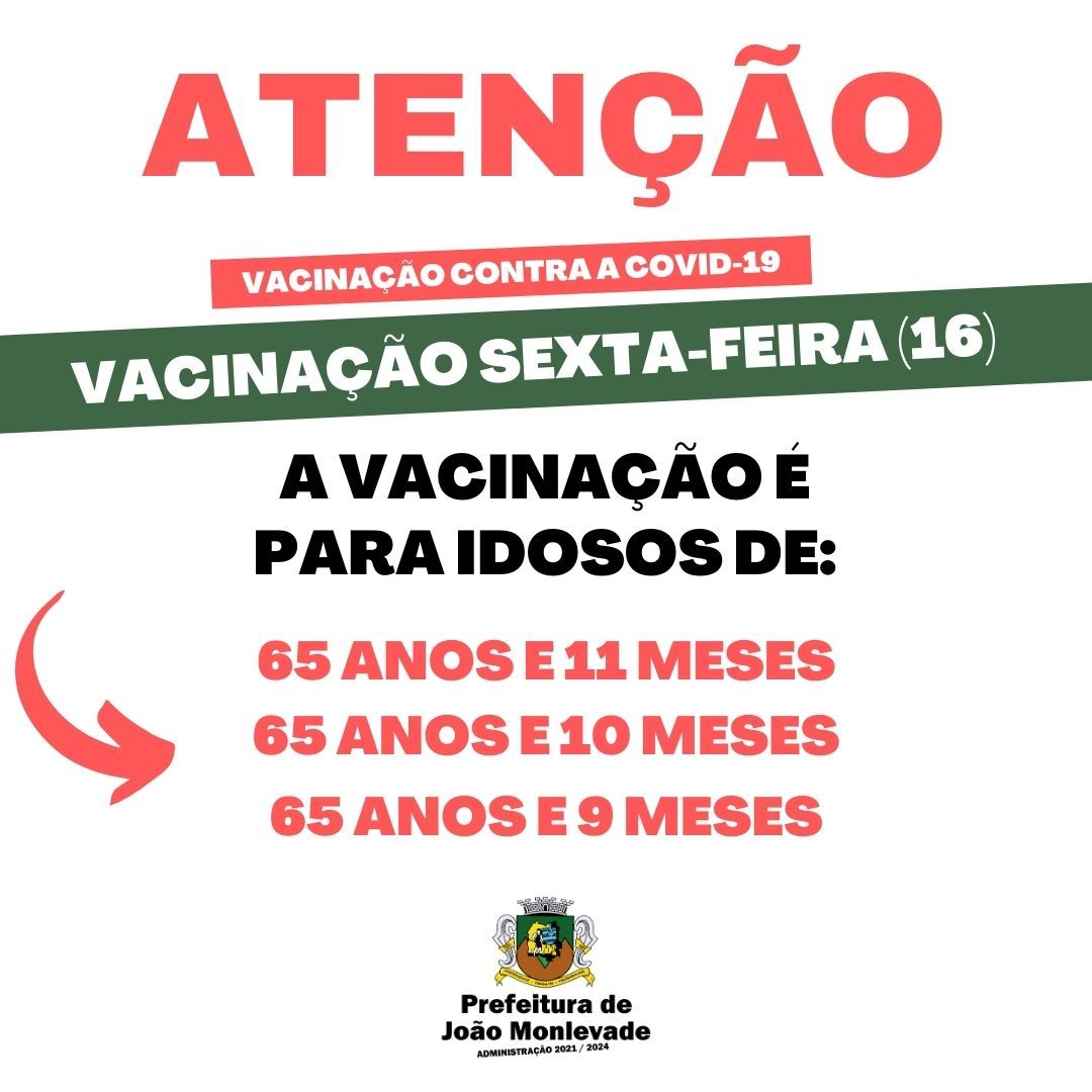 Secretaria de Saúde inicia vacinação de idosos com 65 anos A Secretaria de Saúde de João Monlevade, por meio da Vigilância em Saúde (Visa), começa amanhã, quinta-feira (15), a vacinar contra o coronavírus os idosos de 65 anos. Receberão...