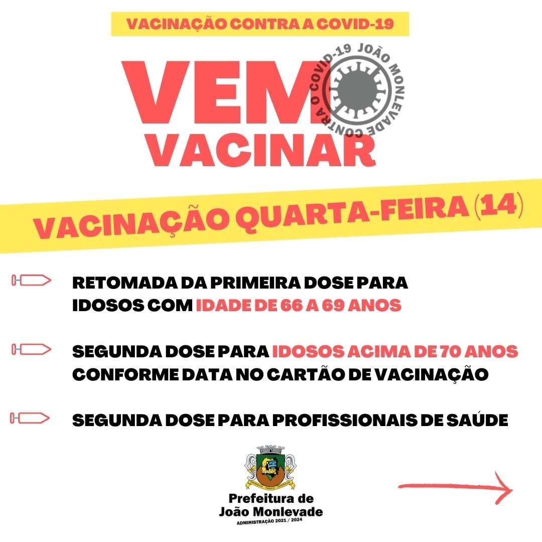 Retomada a vacinação para idosos de 66 a 69 anos Secretaria de Saúde de João Monlevade, por meio da Vigilância em Saúde (Visa) dará continuidade nesta quarta-feira (14), à aplicação da primeira dose da vacina contra o coronavírus, entre...