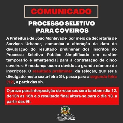 Comunicado processo seletivo para coveiros A Prefeitura de João Monlevade, por meio da Secretaria deServiços Urbanos, comunica a alteração da data de divulgação do resultadopreliminar dos inscritos no Processo Seletivo Público Simplificado ...