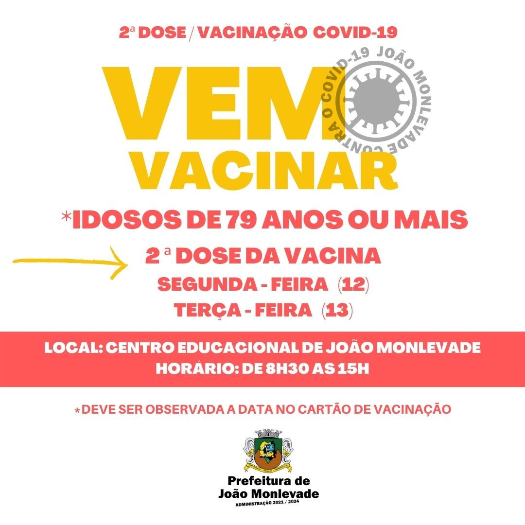 Segunda dose em idosos com 79 anos ou mais prossegue na segunda e na terça A Secretaria de Saúde de João Monlevade, por meio da Vigilância em Saúde (Visa), prossegue com a aplicação da segunda dose da vacina contra o coron...