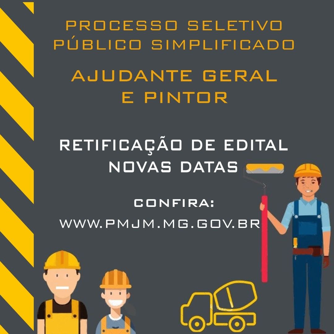 Processo seletivo para pintor e ajudante geral: edital é retificado e datas sofrem mudanças A Prefeitura de João Monlevade, por meio da Secretaria Municipal de Obras e Serviços Urbanos, usando de suas atribuições legais, com o objeti...