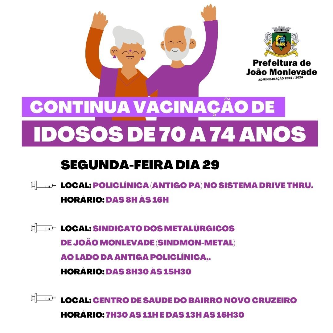 Vacinação de idosos de 70 a 74 continua nesta segunda-feira (29) Os idosos de João Monlevade, com idade de 70 a 74 anos que não receberam a primeira dose da vacina contra o coronavírus no último sábado (27), poderão ser vacinados nesta s...