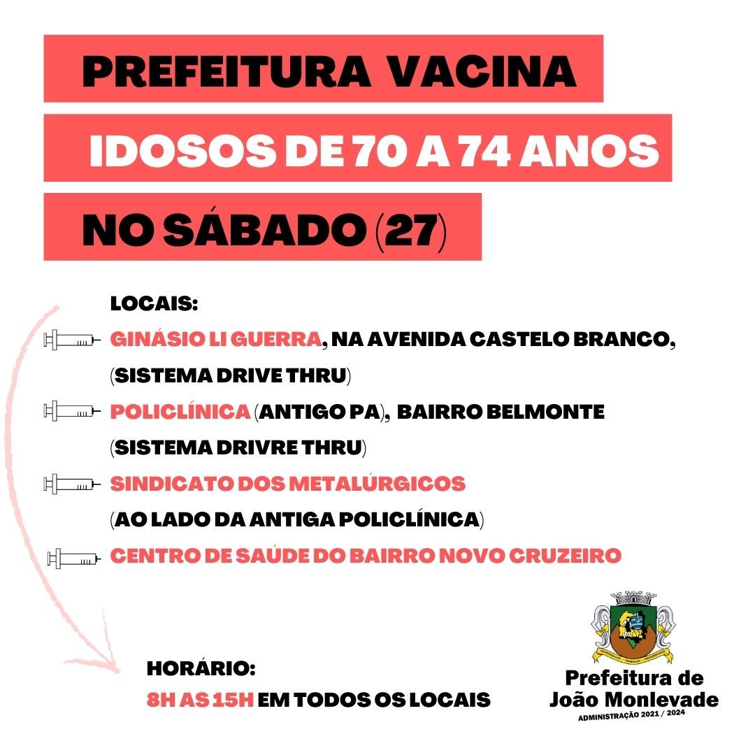 Secretaria de Saúde de João Monlevade vacina idosos de 70 a 74 anos no sábado (27) A Secretaria Municipal de Saúde de João Monlevade, por meio da Vigilância em Saúde (Visa), aplicará no próximo sábado (27) a primeira dose de vacinas cont...