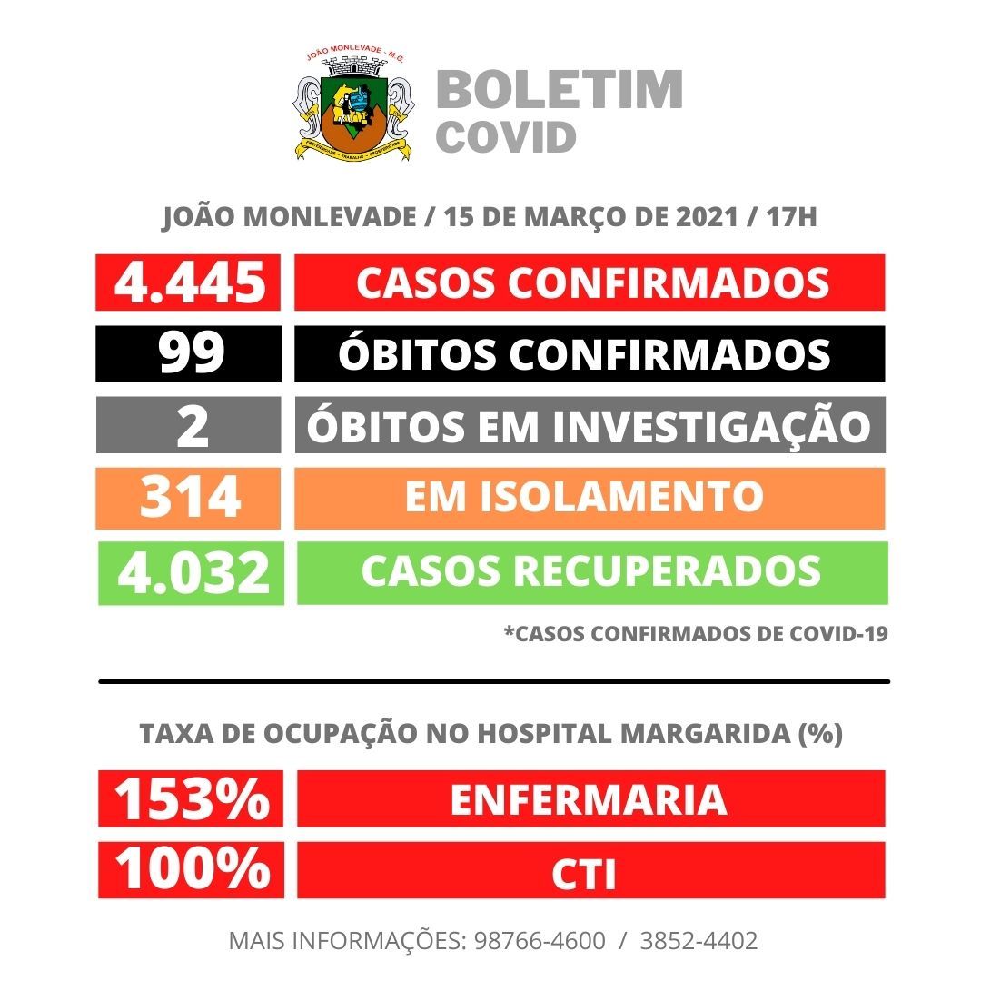 Terça-feira – 16 de março de 2021 Foram registrados mais 58 casos de coronavírus em João Monlevade. Internações no Hospital Margarida Dos 335 pacientes positivos de João Monlevade que estão em isolamento, 2 estão na enfermaria e...