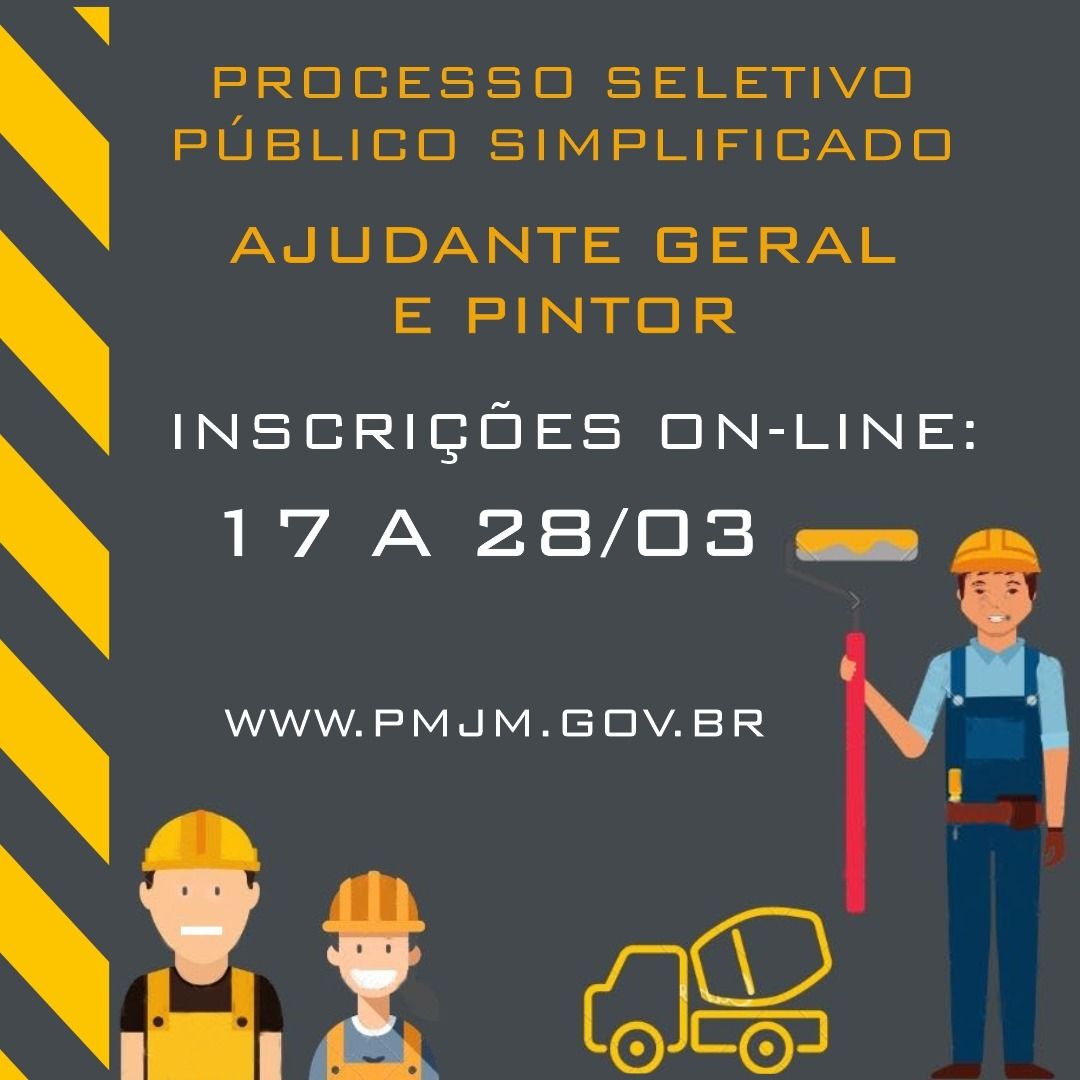 A Prefeitura de João Monlevade, por meio da Secretaria Municipal de Obras e Secretaria Municipal de Serviços Urbanos, contrata ajudante geral e pintor. A seleção ocorre por Processo Seletivo Público Simplifica...