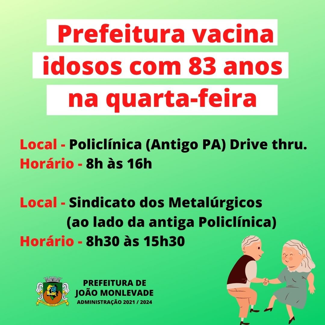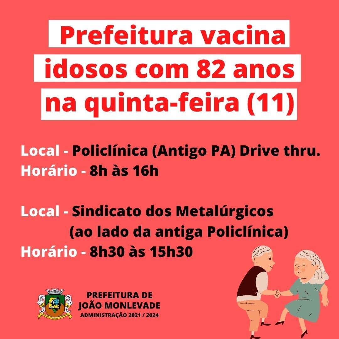 Secretaria de Saúde de João Monlevade vacina idosos com 82 anos na quinta-feira A Secretaria Municipal de Saúde de João Monlevade, por meio da Vigilância em Saúde (Visa), vai vacinar contra o coronavírus os idosos com idade de 82 anos, am...