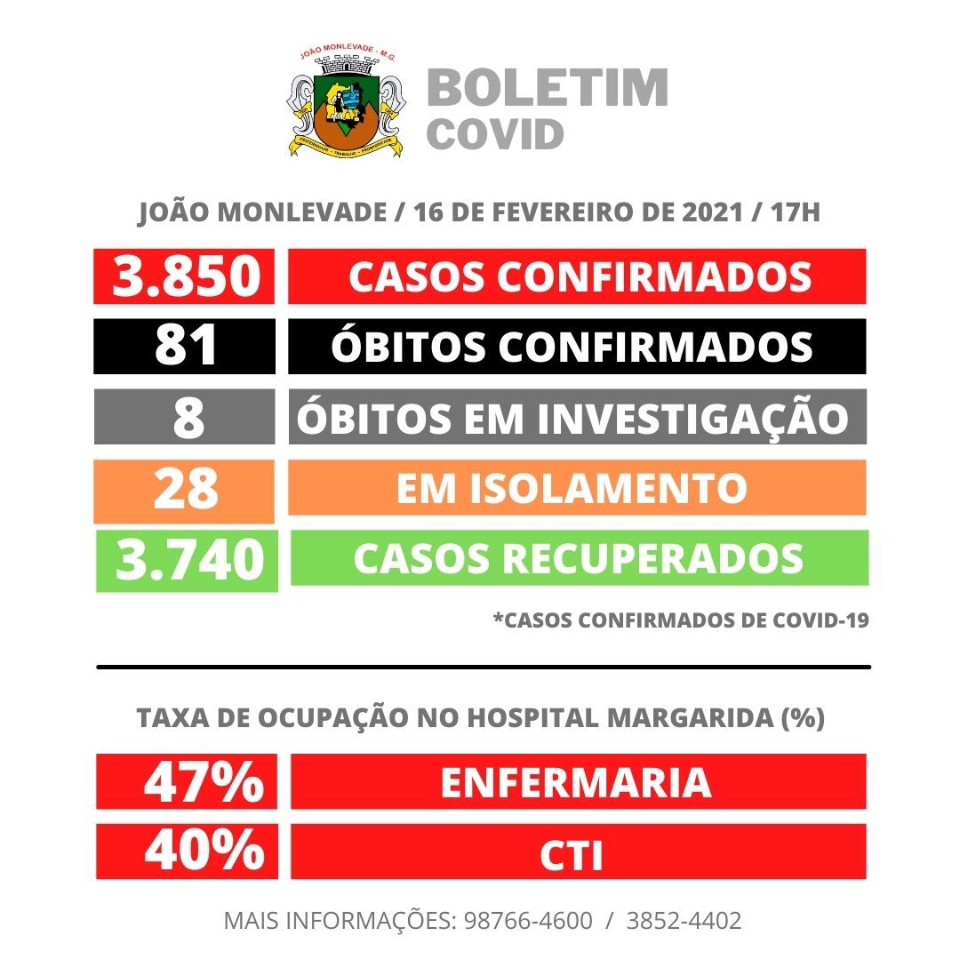 Terça-feira 16 de fevereiro de 2021 Foi registrado mais 5 casos de coronavírus em João Monlevade. Hoje foi registrado um óbito causado por coronavírus. Trata-se de paciente do sexo feminino, de 66 anos, que faleceu na noite de ontem. Po...