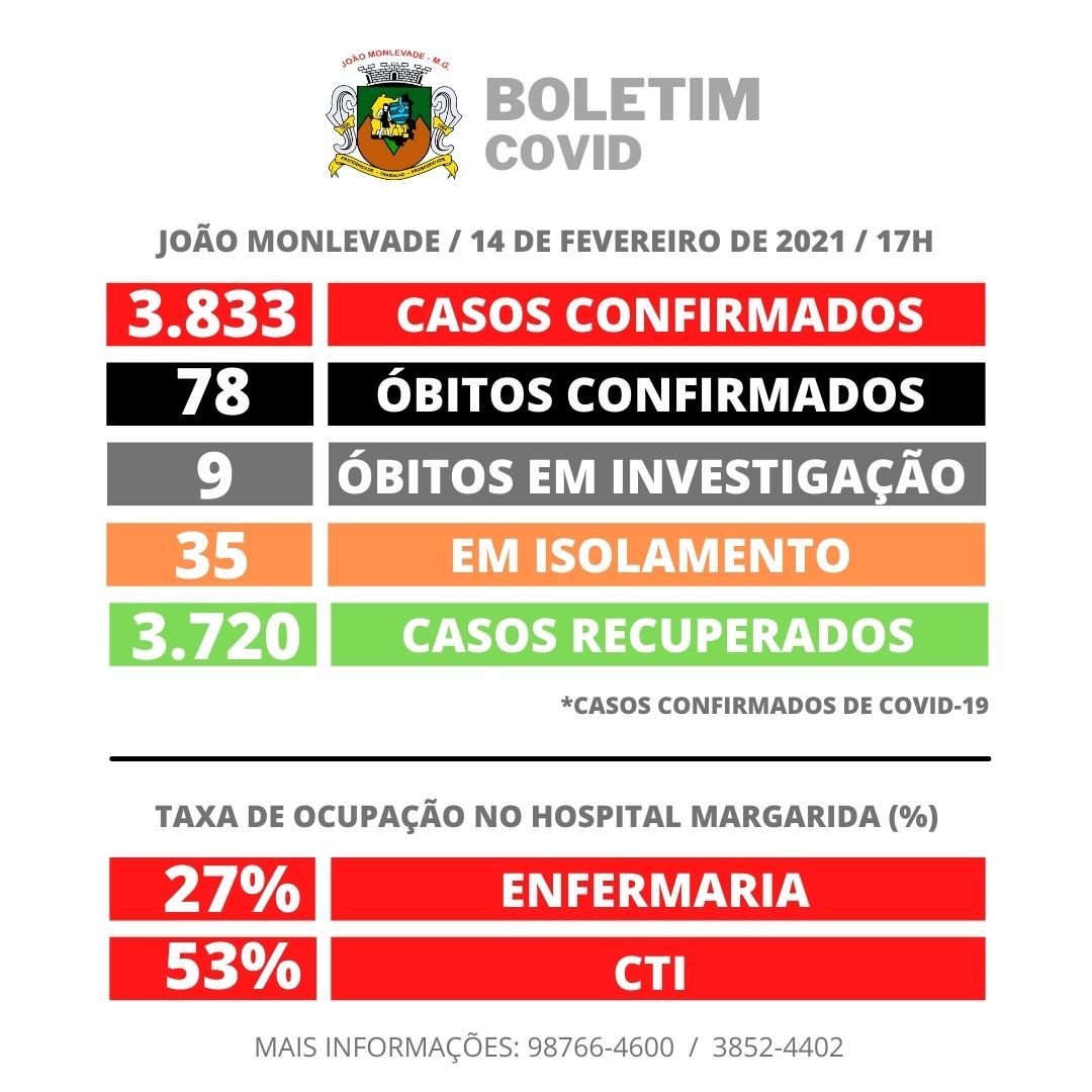 Sábado 13 de fevereiro de 2021 Foram registrados mais 5 casos de coronavírus em João Monlevade Positivos de João Monlevade internados Dos 34 pacientes positivos de João Monlevade que estão em isolamento, 1 está na enfermaria e 4 no CT...