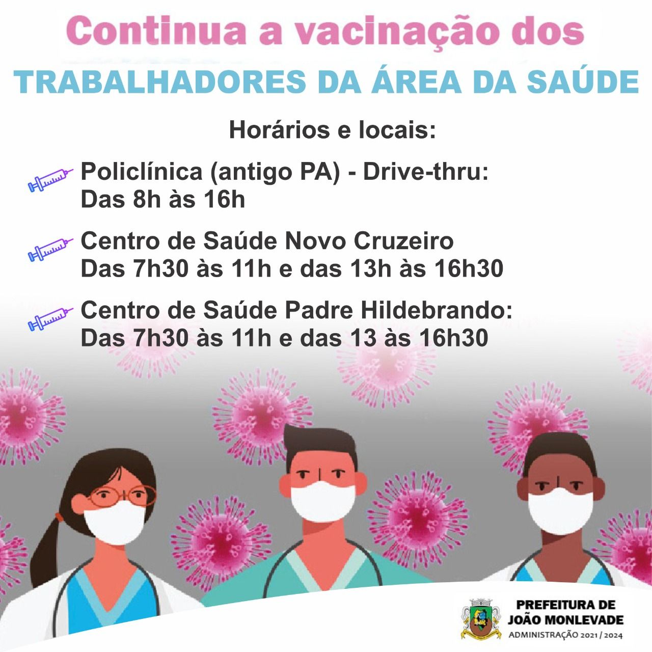 Vacinação de trabalhadores da saúde prossegue ao longo da semana A vacinação dos trabalhadores da saúde prossegue em João Monlevade na quarta-feira (17) e ao longo da semana, em três postos de vacinação. Para se vacinarem os trabalhadore...