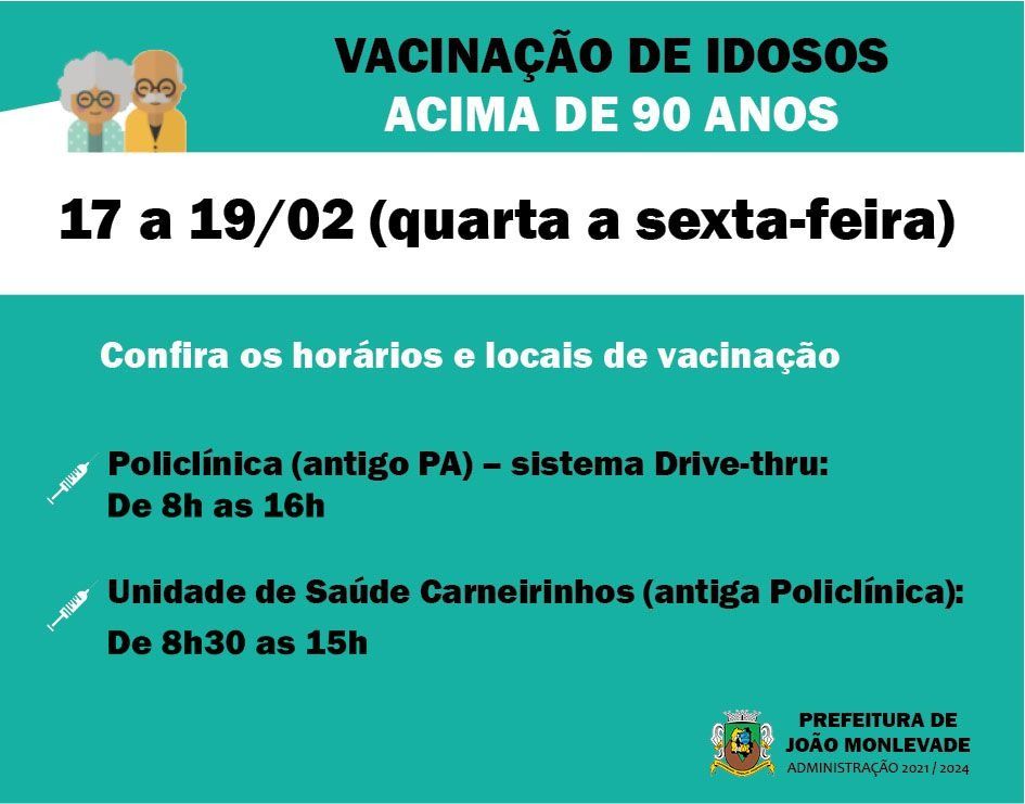 Vacinação de idosos acima de 90 anos continua em dois postos de saúde A vacinação dos idosos com idade acima de 90 anos continua na quarta-feira (17) somente em dois locais em João Monlevade. A imunização que estava ocorrendo em cinco post...