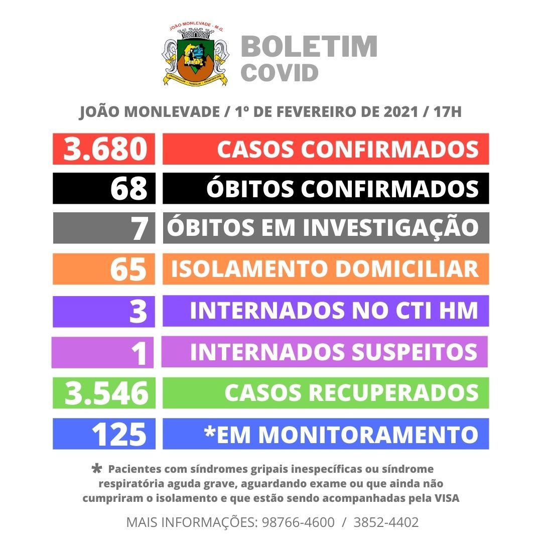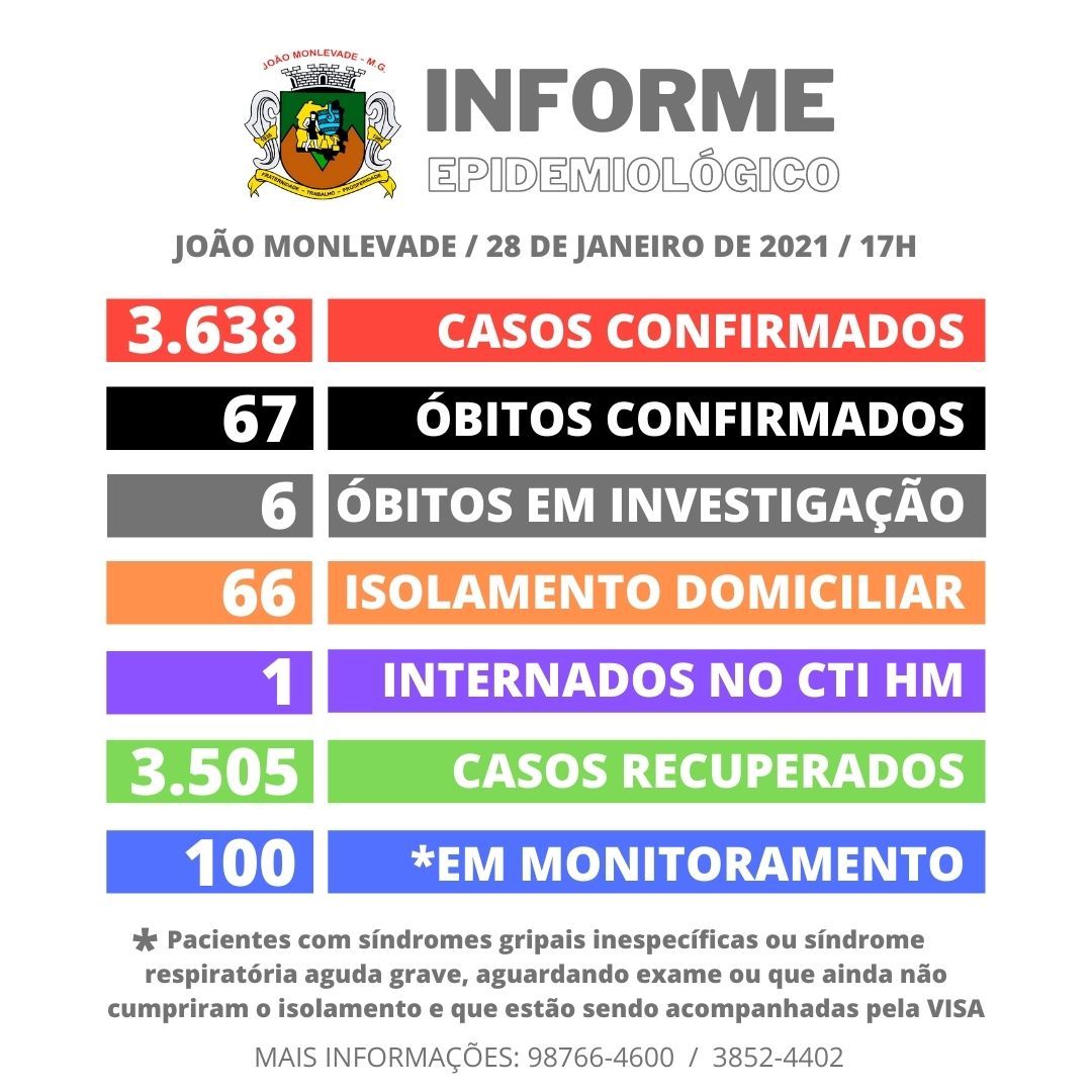 Quinta-feira – 28 de janeiro de 2021 Nesta quinta-feira foram registrados 19 novos casos de coronavírus em João Monlevade. O óbito registrado ontem no boletim foi erroneamente lançado como paciente do município de João Monlevade. Portan...