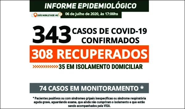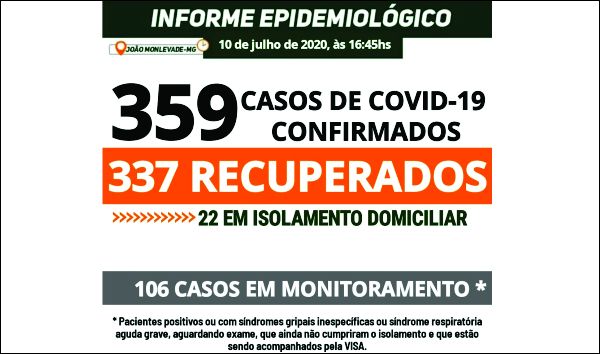 MONLEVADE TEM 359 CASOS DE COVID-19. AGORA, 337 PACIENTES ESTÃO RECUPERADOS DA DOENÇA Os casos confirmados hoje são: - uma mulher, de 29 anos, em isolamento domiciliar - três homens, de 21, 44 e 50 anos, dois deles já recuperados da doença...