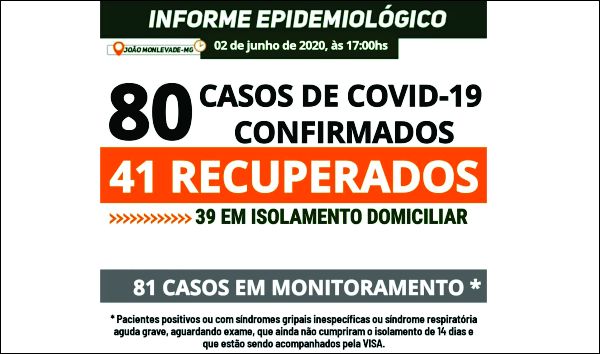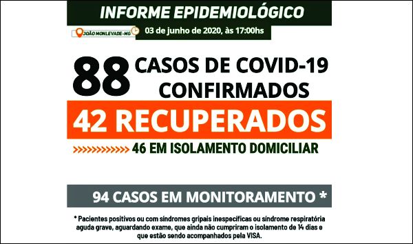 MONLEVADE TEM 88 CASOS DE COVID-19. DESSES, 42 PACIENTES ESTÃO RECUPERADOS DA DOENÇA Os casos confirmados hoje, em isolamento domiciliar, são: - dois homens, de 38 e 43 anos, e uma mulher, de 38 anos, testados em outro município, mas reside...