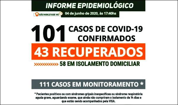 MONLEVADE TEM 101 CASOS DE COVID-19. NÃO HÁ PACIENTES INTERNADOS COM A DOENÇA E, AGORA, 43 ESTÃO RECUPERADOS Os casos confirmados hoje, testados pela rede particular e em isolamento domiciliar, são: - um homem, de 41 anos, e uma mulher, de...